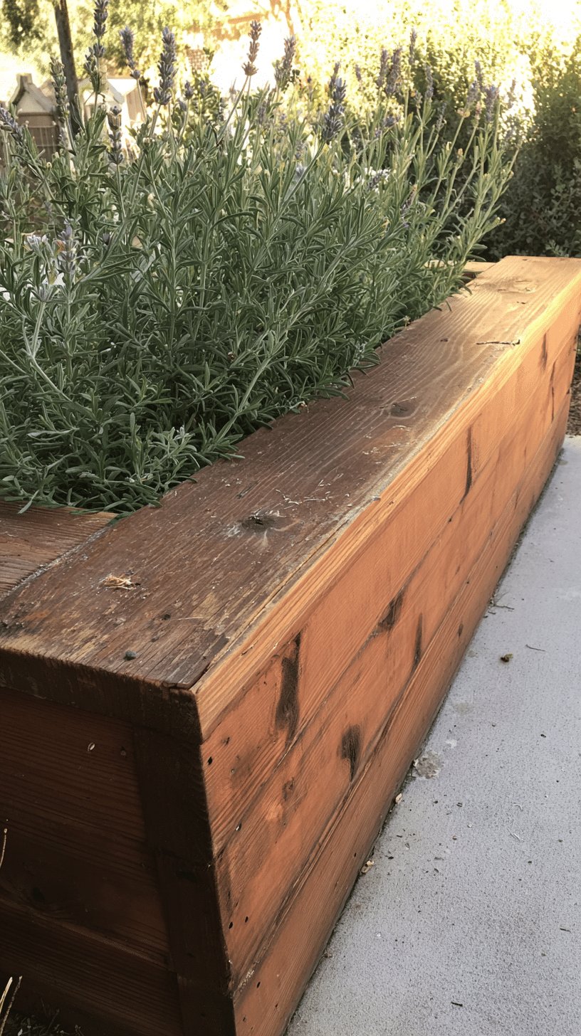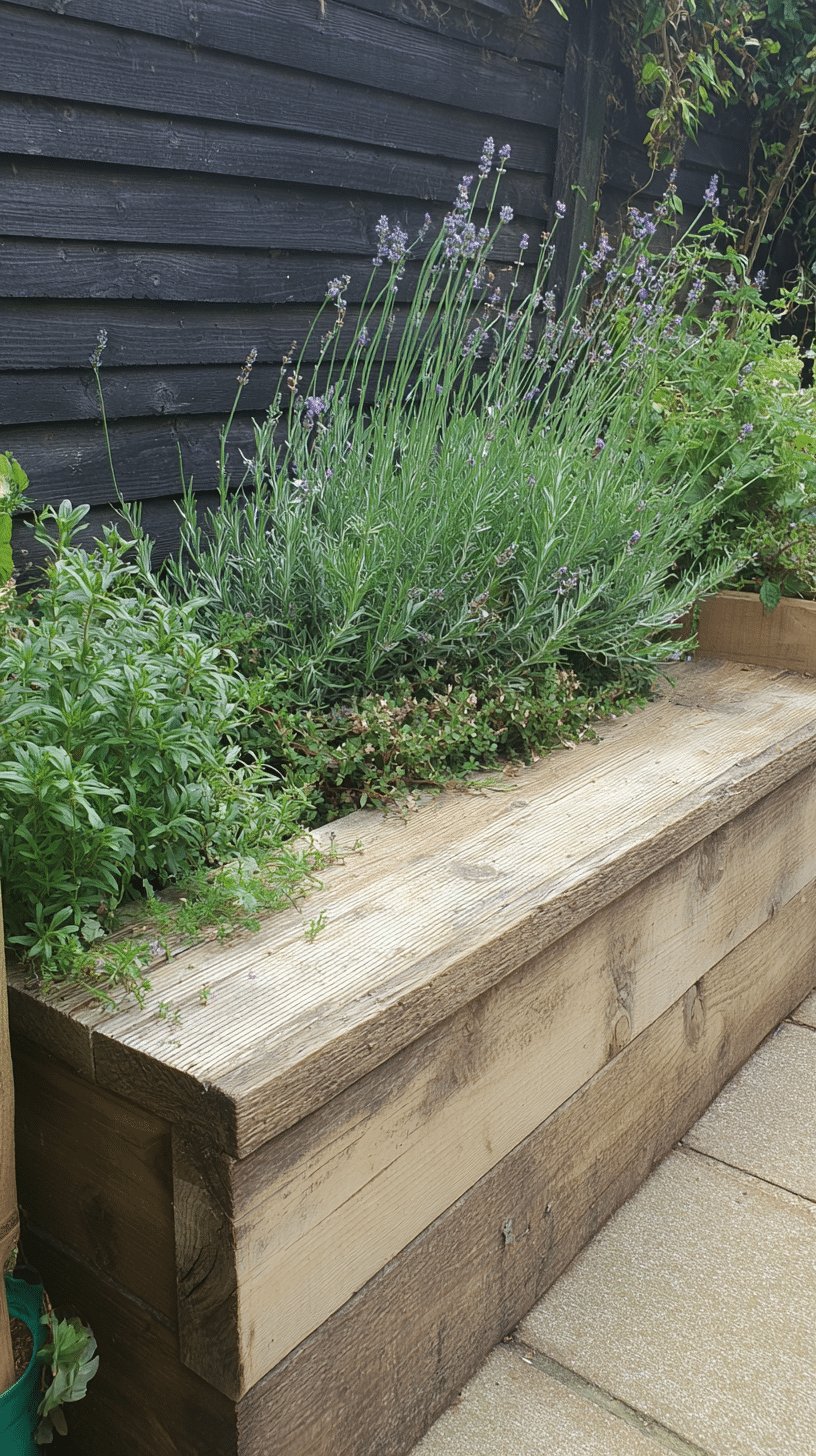 Lavender spikes give height and a soft purple haze, while low herbs at the front add texture and usefulness — hello, snip-and-cook moments. The grain and tiny cracks in the timber read as personality, not flaw.
