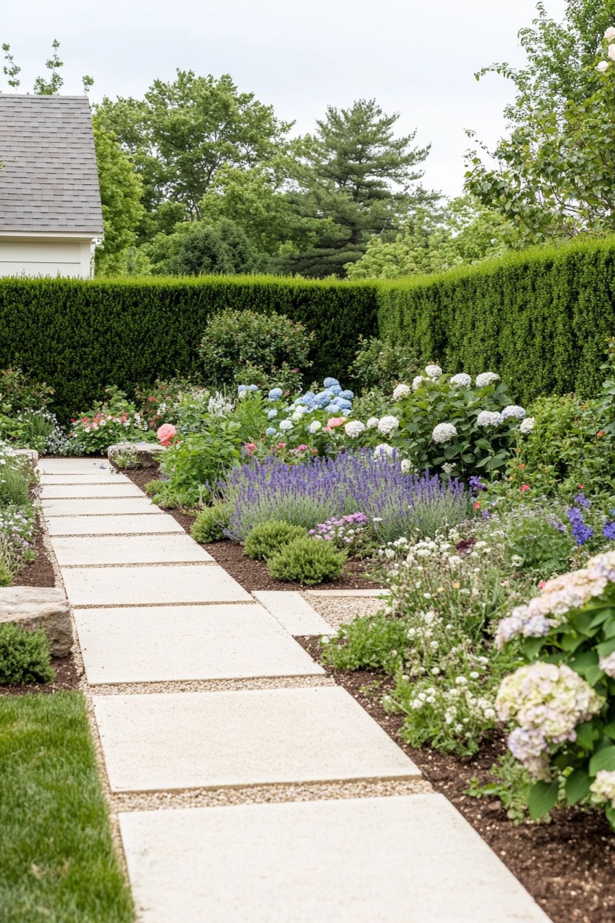I adore the harmonious blend of colors and textures in this garden design. The soft blues and whites of hydrangeas paired with vibrant lavender create a serene yet inviting atmosphere.