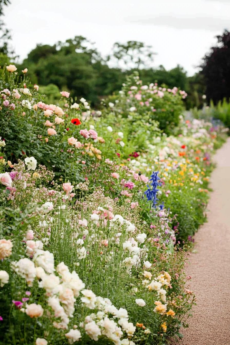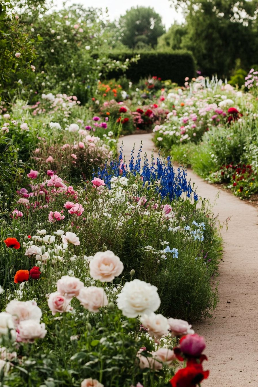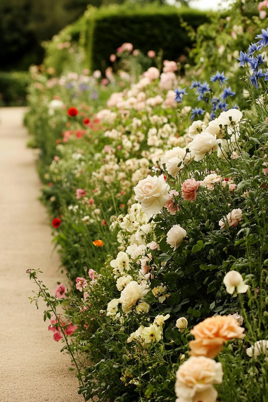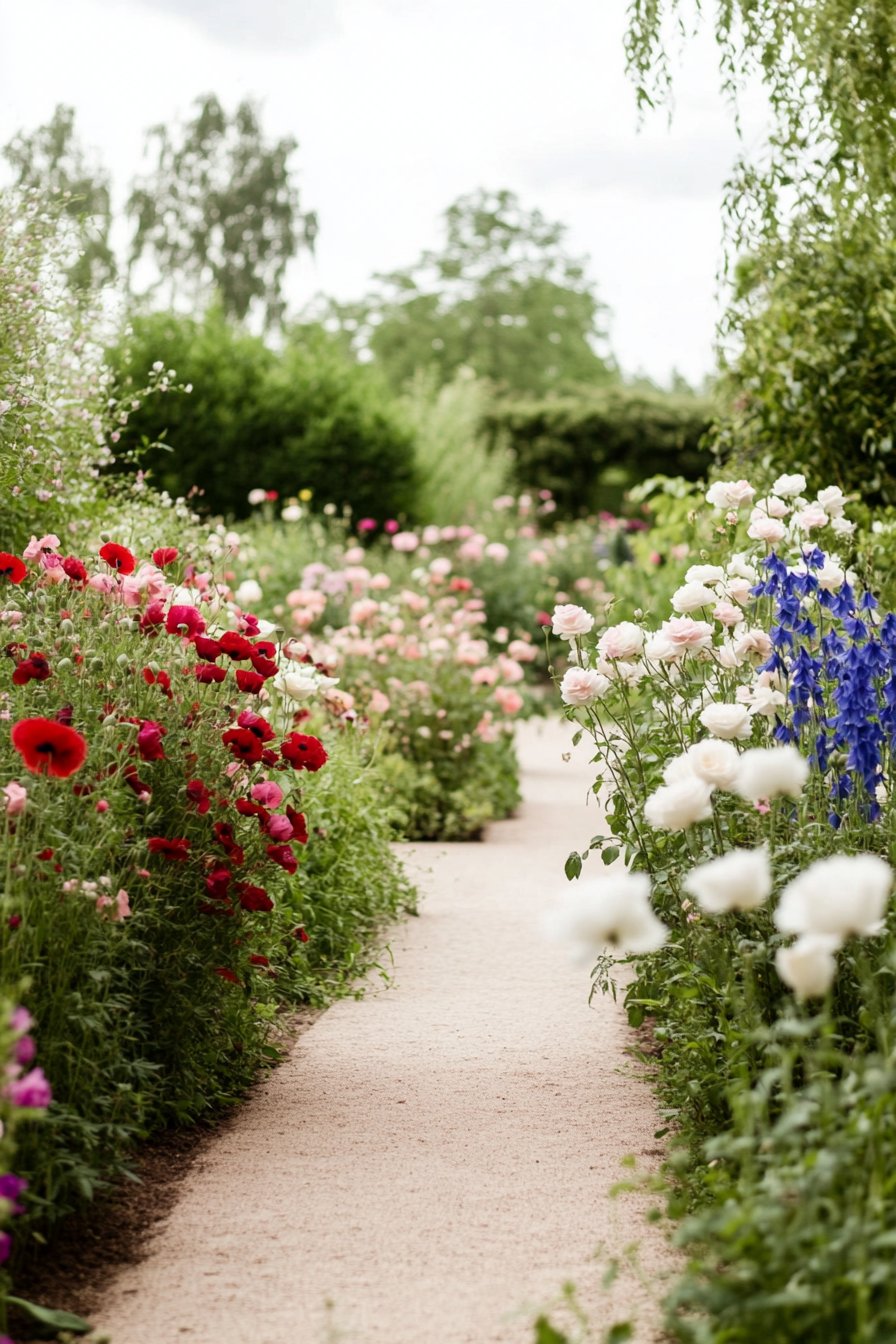 This design features a delightful mix of pastel roses, vibrant poppies, and striking delphiniums. The lush planting creates a soft, romantic pathway that invites exploration.