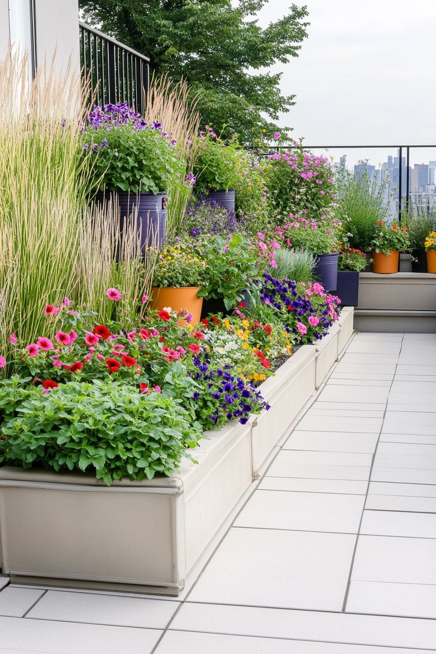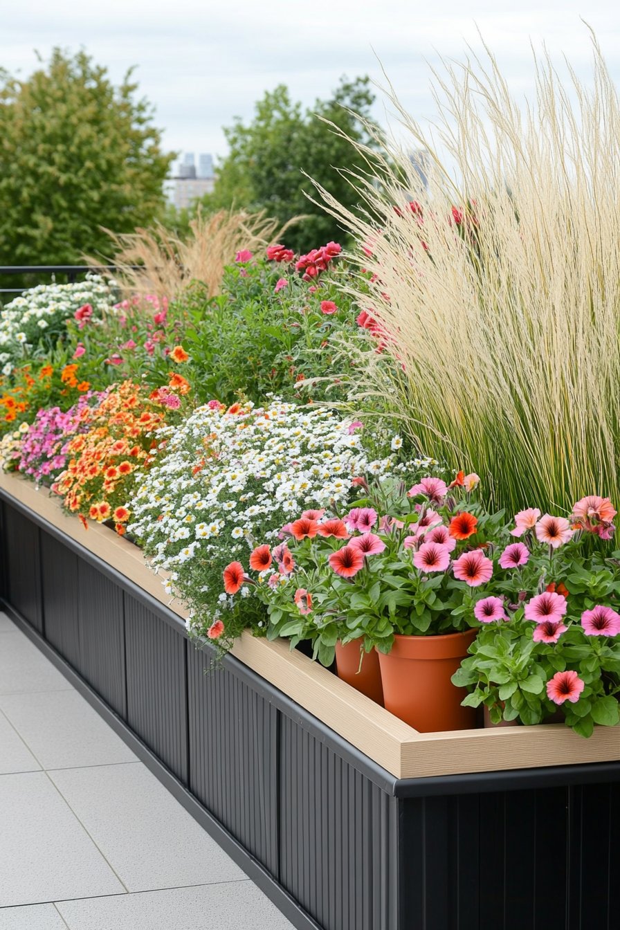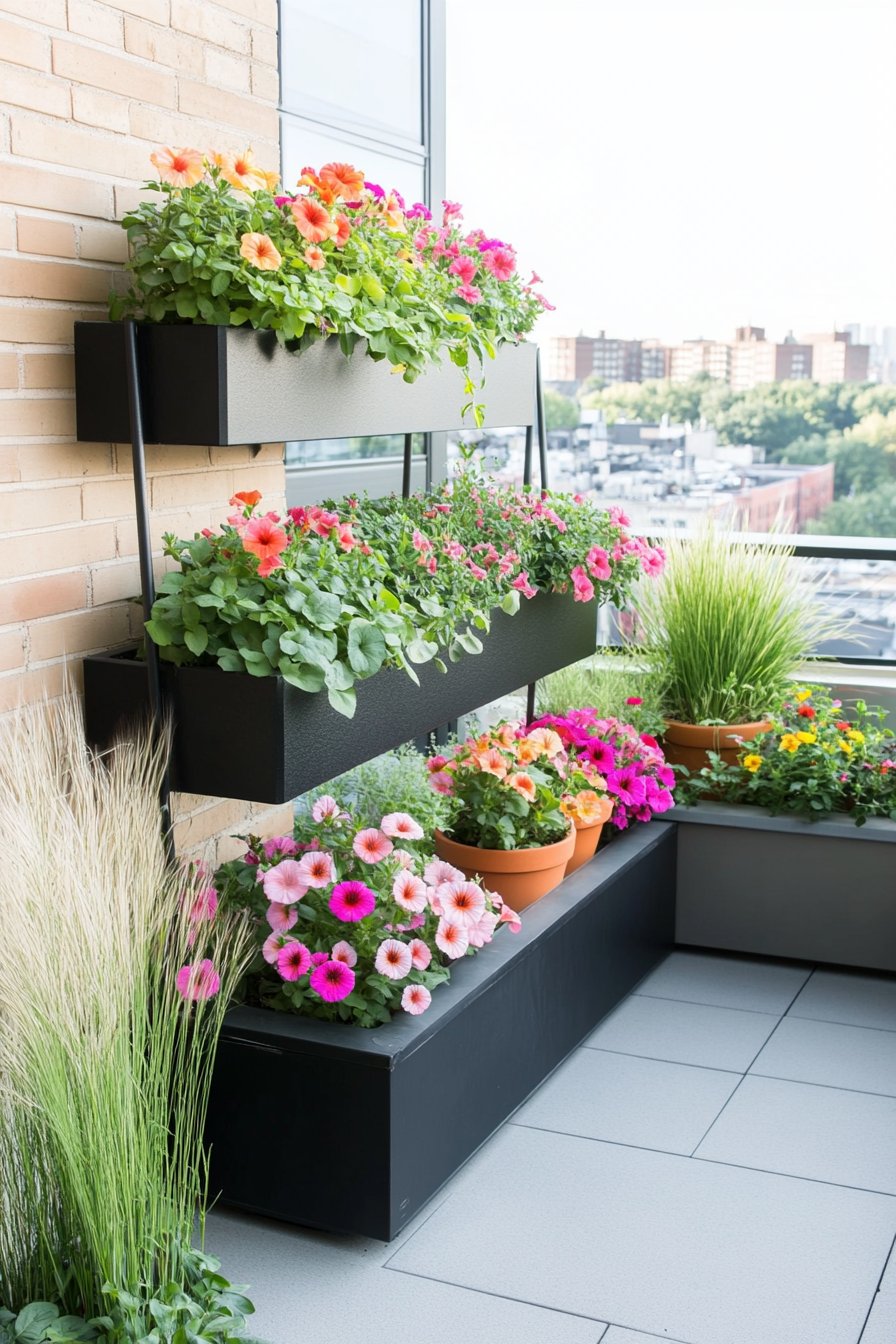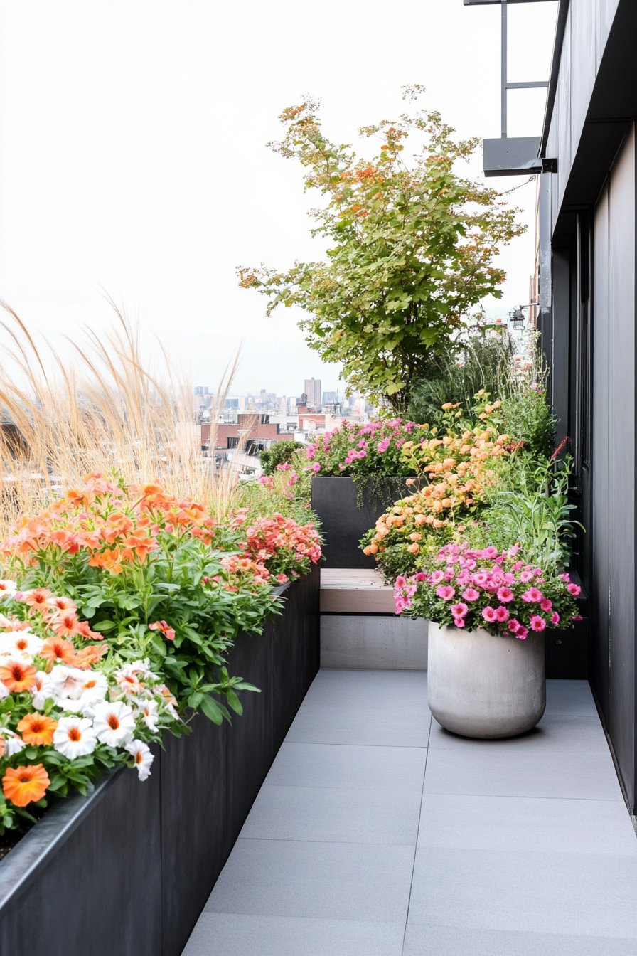 This design showcases a stunning array of colorful flowers in sleek, modern planters, creating a vibrant urban retreat. The combination of cascading blooms and lush greenery adds a refreshing touch to any space.