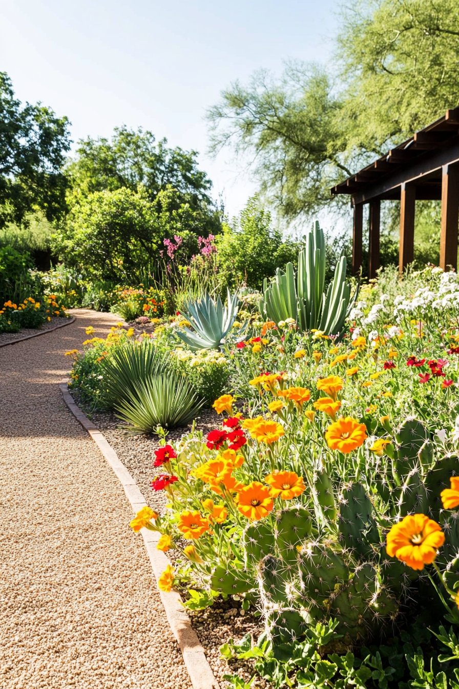 This garden showcases a stunning blend of colorful flowers and architectural plants, creating a lively and inviting atmosphere. The pathway meanders gracefully, guiding visitors through vibrant pops of orange, red, and lush greens.