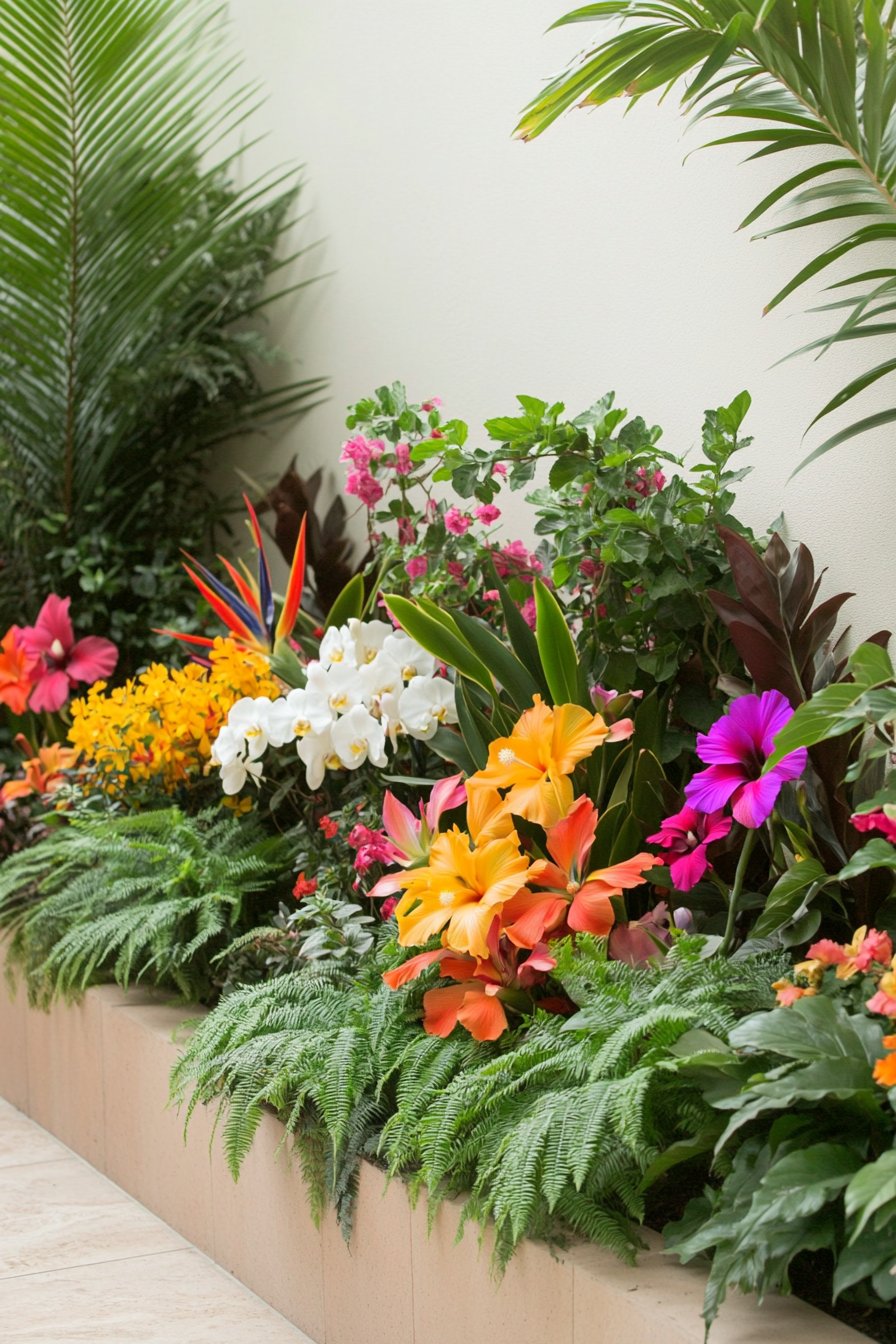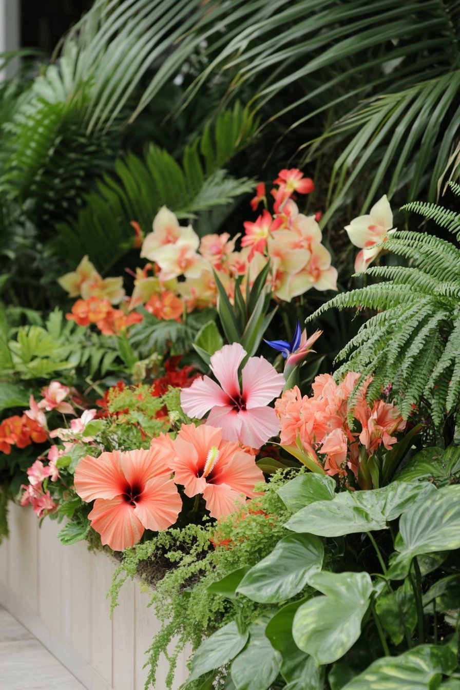 To achieve a similar look, I recommend incorporating a mix of tropical flowers and lush ferns for texture. Use a clean, modern planter to highlight the vibrant plants and keep the space looking fresh and organized.