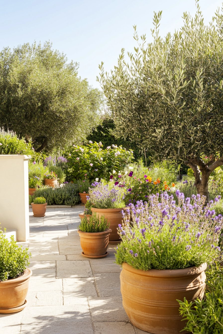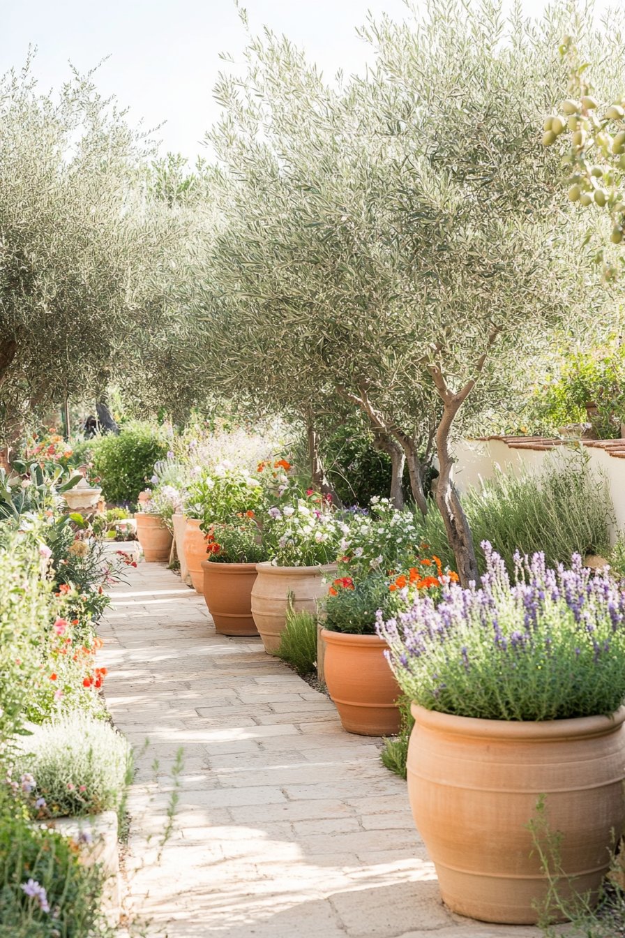 I adore the harmonious blend of terracotta pots filled with vibrant blooms alongside neatly paved paths under the shade of olive trees. To recreate this look, I recommend using a mix of colorful annuals and perennials in large containers, while ensuring a variety of textures and heights for visual intrigue.