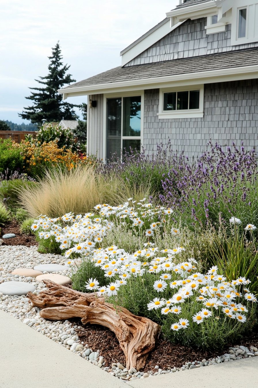 I adore the charming blend of soft whites and vibrant greens in this garden design. The daisies and lavender create a serene yet lively atmosphere, perfect for any outdoor space.