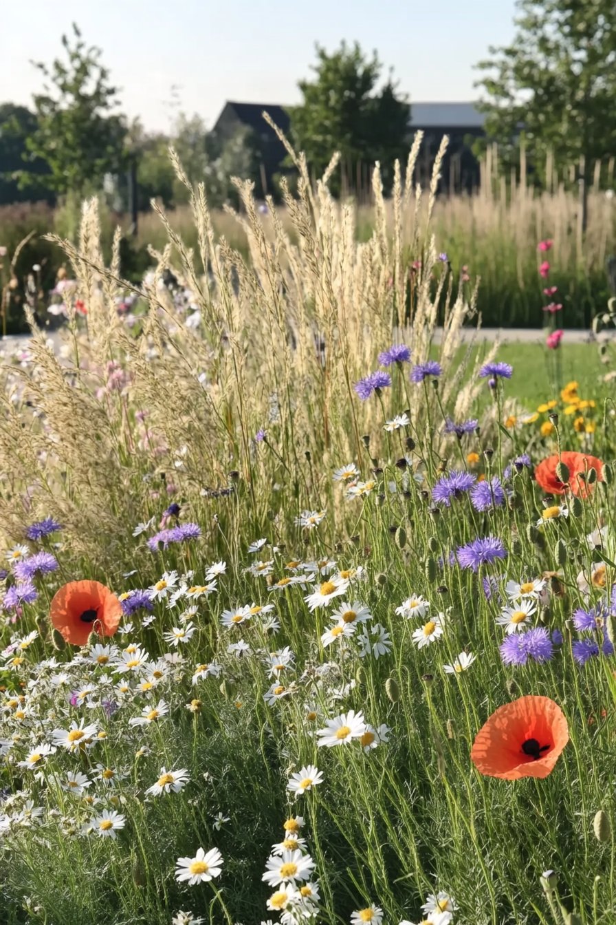 To achieve a similar look, I recommend planting a mix of annual and perennial wildflowers to ensure continuous blooms throughout the season. Incorporating ornamental grasses will enhance the visual interest and provide a natural, relaxed feel.