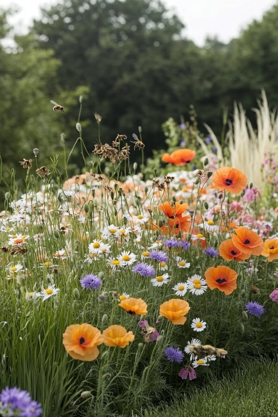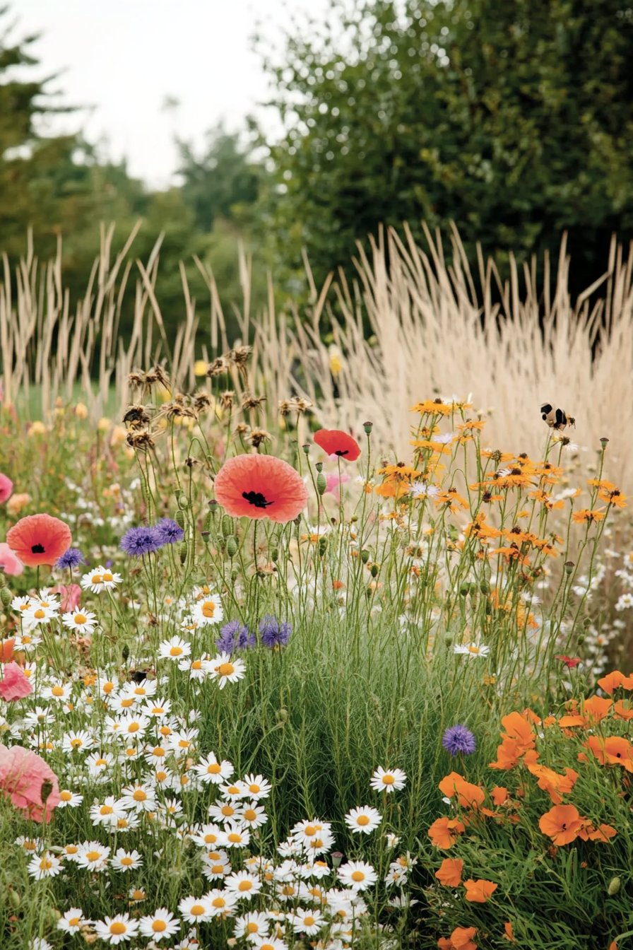 I adore the lively mix of colors in this wildflower garden, showcasing bold poppies, cheerful daisies, and vibrant orange blooms. The tall grasses in the background add texture and movement, creating a harmonious balance.
