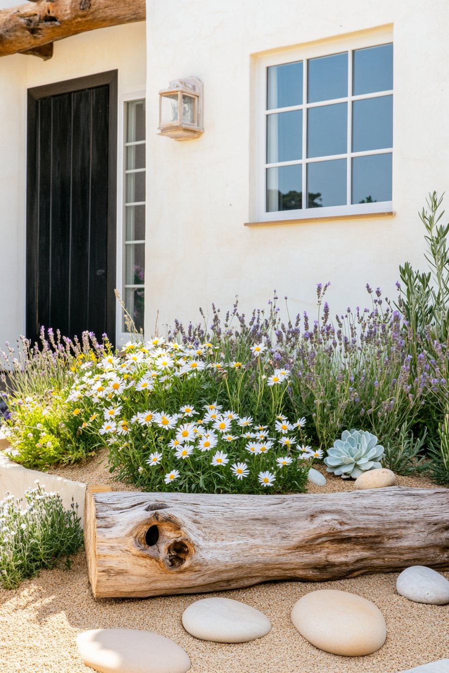 This design beautifully combines soft pastel colors with natural elements. The daisies and lavender create a soothing atmosphere, while the rustic log adds a charming focal point.