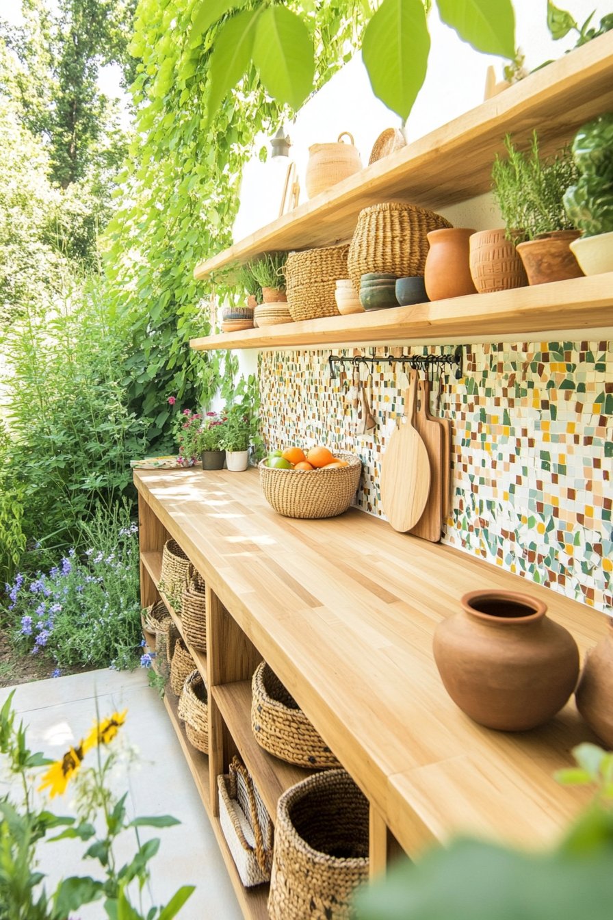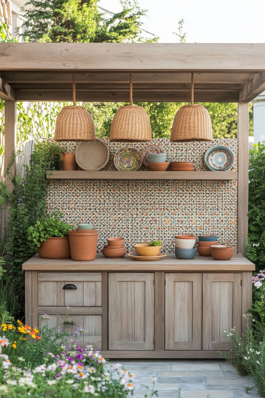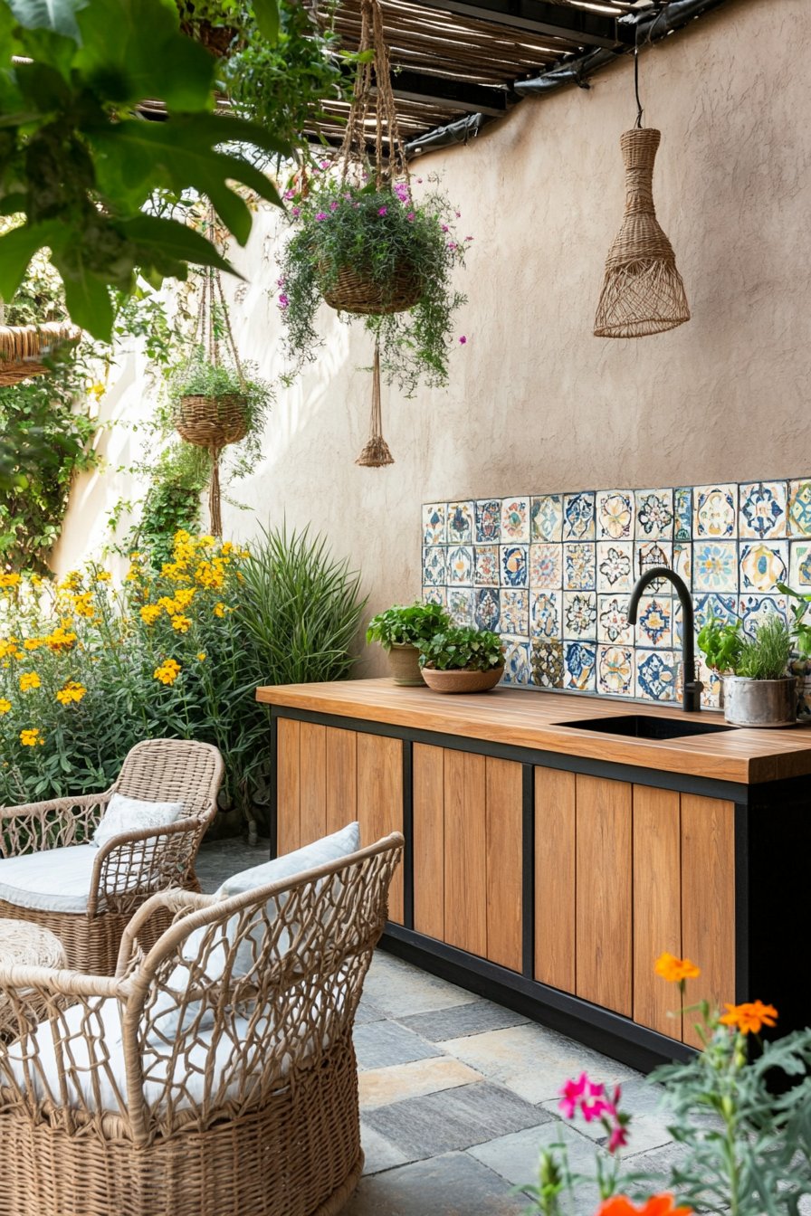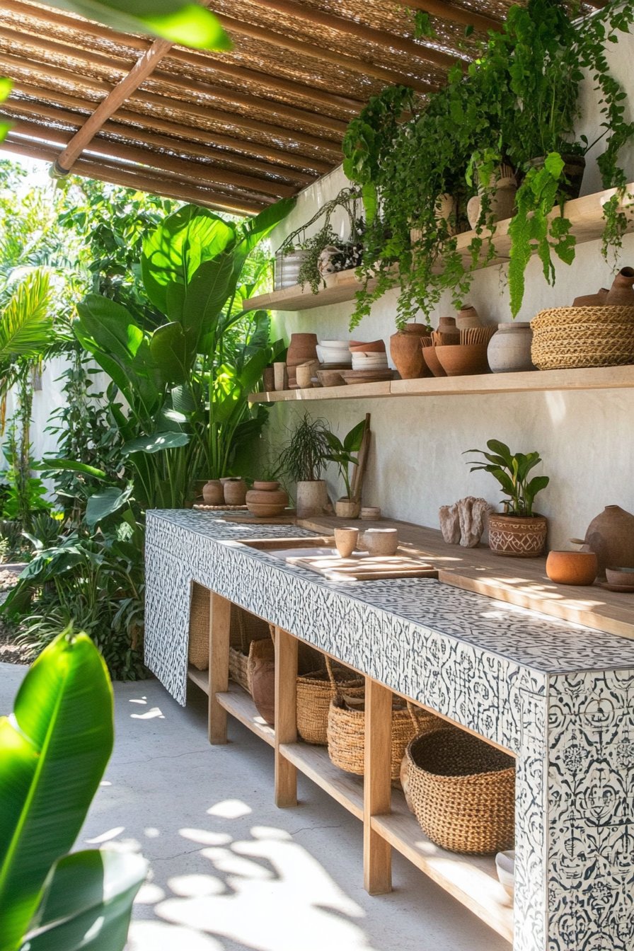 This garden design beautifully blends rustic charm with functionality, featuring a stunning outdoor kitchen crafted from reclaimed wood that radiates warmth and character. The vibrant plants, like lush ferns and aromatic herbs, create a refreshing atmosphere, while the intricate tile patterns and woven accessories add a touch of artisanal elegance.