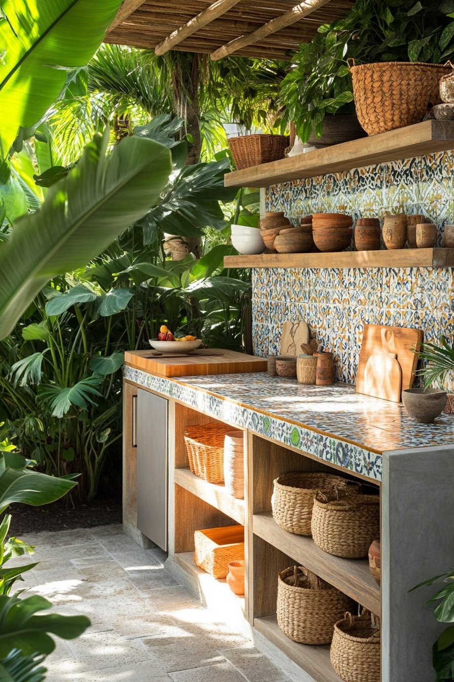 The vibrant fusion of lush tropical plants and a rustic outdoor kitchen creates an inviting oasis that truly captivates the senses. With striking accents like banana leaves, philodendrons, and terracotta pots, the space feels alive, while the colorful tiled countertop adds a splash of personality and warmth.