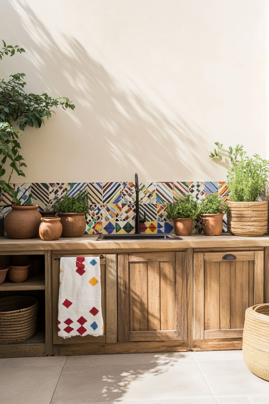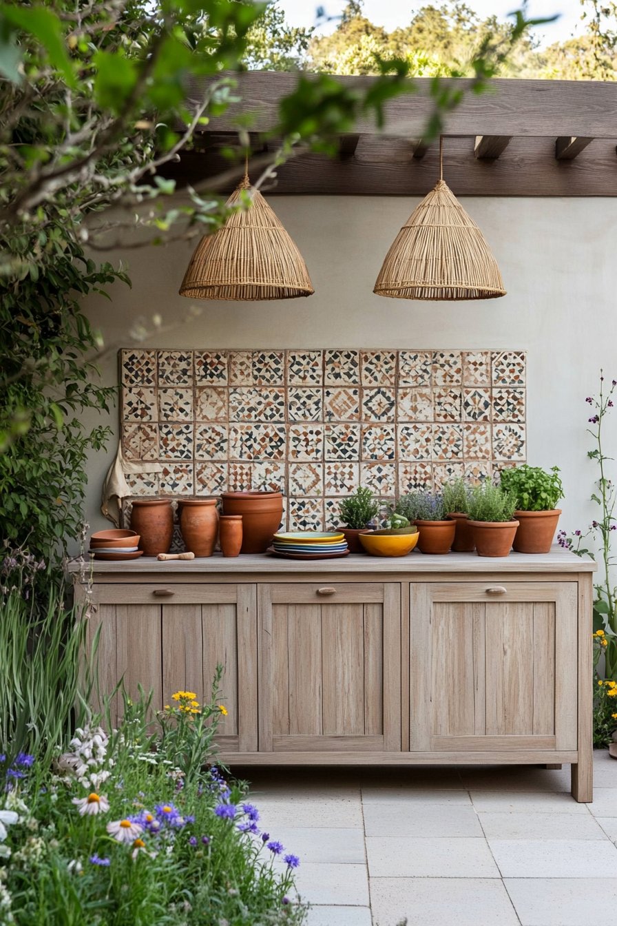 The design is a delightful blend of rustic charm and Mediterranean flair, featuring an inviting wooden cabinet adorned with terracotta pots filled with fragrant herbs like basil, rosemary, and thyme. Vibrant colors from the dishes and the intricate tile backdrop create a warm atmosphere, while the lush greenery and blooming wildflowers add a touch of natural beauty.