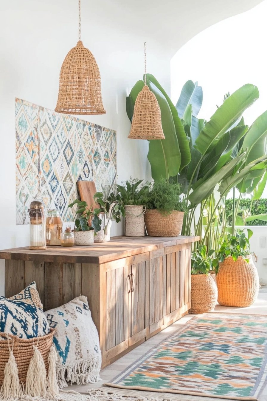 This design captivates with its lush greenery and vibrant textures, featuring large tropical leaves alongside playful patterns in textiles and rugs that create a cozy, inviting atmosphere. Incorporating plants like bird of paradise and snake plants, paired with rustic wooden furniture and woven accessories, enhances the bohemian vibe while offering a perfect retreat for relaxation.