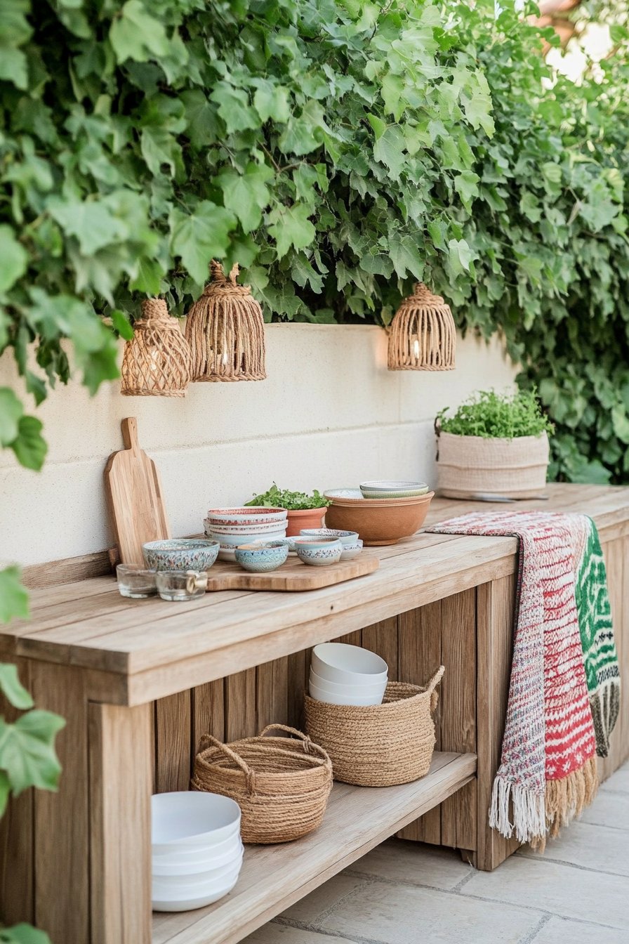 The enchanting blend of rustic charm and flair captivates me, with lush greenery draping gracefully over a simple wooden countertop that invites leisurely gatherings. The use of terracotta pots filled with aromatic herbs like basil and thyme, alongside woven accents and colorful dishware, creates a warm and inviting atmosphere perfect for alfresco dining.