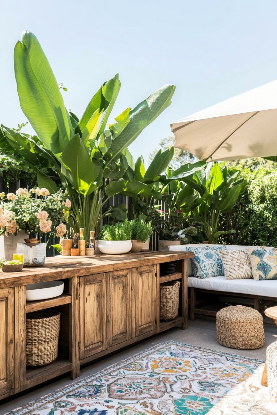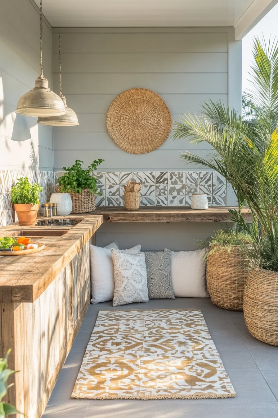 This garden design beautifully blends rustic charm with tropical flair, featuring a warm wooden countertop paired with lush greenery like basil and palm plants that create a refreshing oasis. The earthy tones of woven baskets and decorative pillows, along with a patterned rug, invite relaxation and make it a perfect spot for gathering with friends and family.
