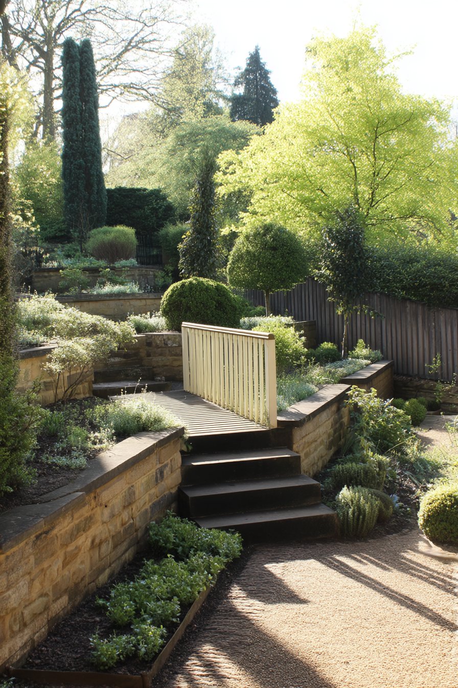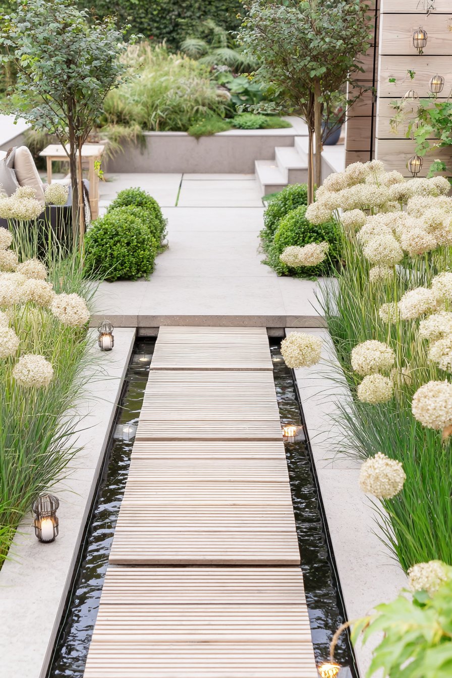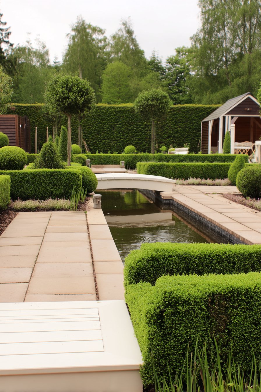 This features meticulously shaped boxwood hedges that create a striking geometric layout, complemented by serene water elements for a tranquil atmosphere. To replicate this look, consider using dwarf boxwoods for structure and incorporate a simple wooden bridge to enhance visual interest.