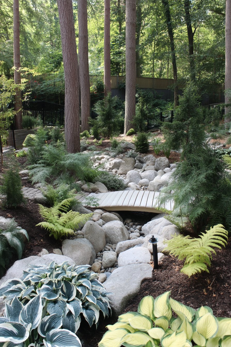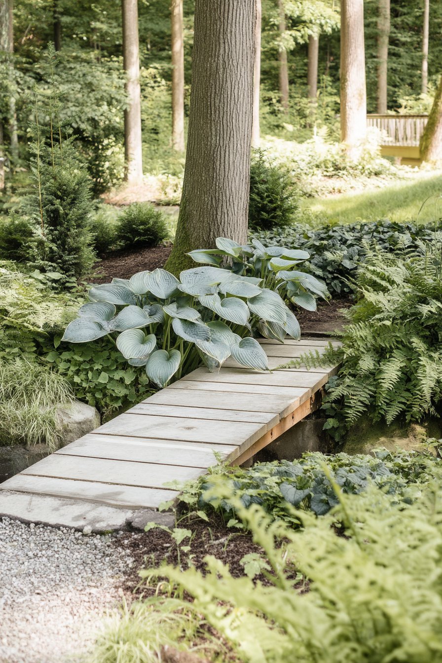 The harmonious blend of lush hostas and delicate ferns creates a tranquil woodland retreat, beautifully complemented by natural stone pathways and a charming wooden bridge. To replicate this serene look, incorporate shade-loving plants and strategically place stones for a balanced, organic feel in your garden.