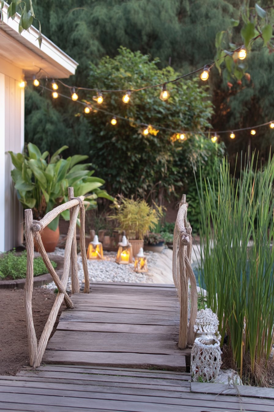 The rustic wooden bridge, accented by ambient lighting and lush greenery, creates a serene pathway that invites exploration. Incorporate like ornamental grasses and low-maintenance lanterns to enhance your own garden’s charm.
