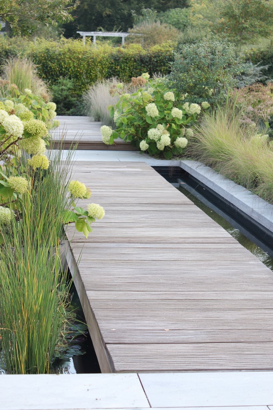 The harmonious blend of soft green hydrangeas and graceful ornamental grasses creates a serene oasis, inviting tranquility and elegance. To replicate this look, consider using a wooden boardwalk to connect different garden areas while incorporating lush, low-maintenance plants for visual interest.