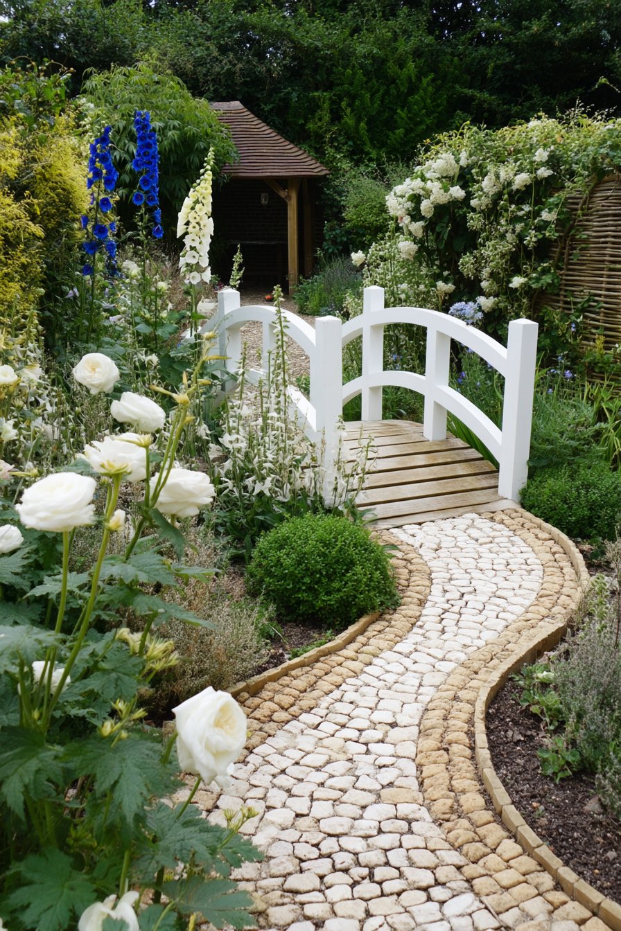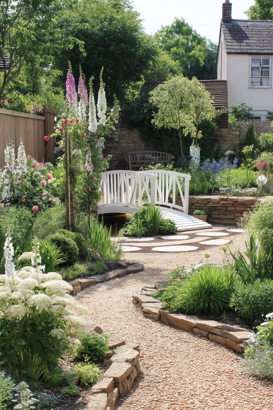 The elegant white roses create a stunning contrast against the lush greenery, guiding visitors along a charming, winding stone pathway. Incorporating tall delphiniums and foxgloves adds vertical interest, while a simple wooden bridge enhances the serene atmosphere—perfect for a tranquil retreat.