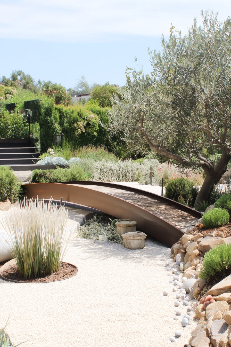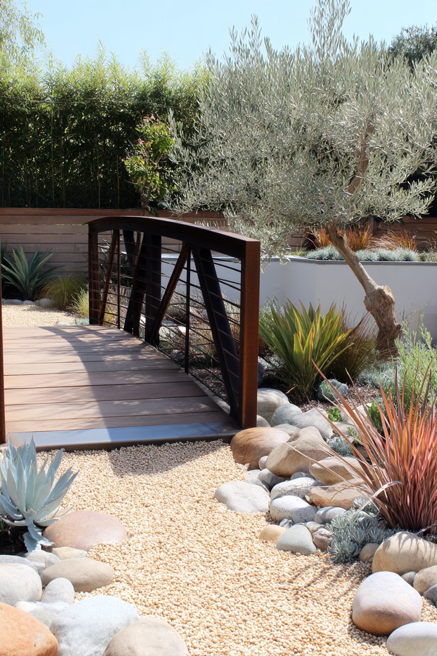 Incorporating soft, flowing grasses like fountain grass alongside structured elements such as a sleek bridge creates a harmonious balance. Use gravel paths and strategically placed planters to enhance the serene, minimalist aesthetic.