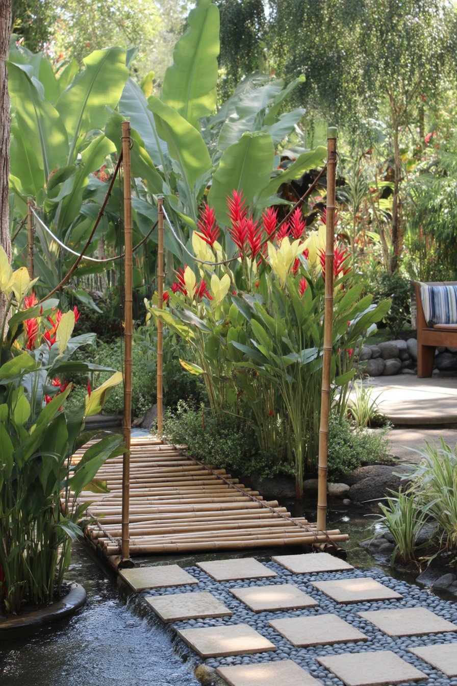 The vibrant reds of heliconias contrast beautifully with lush tropical foliage, creating a stunning visual escape. To replicate this look, plant heliconias alongside large-leaved plants and incorporate a bamboo bridge for added charm.