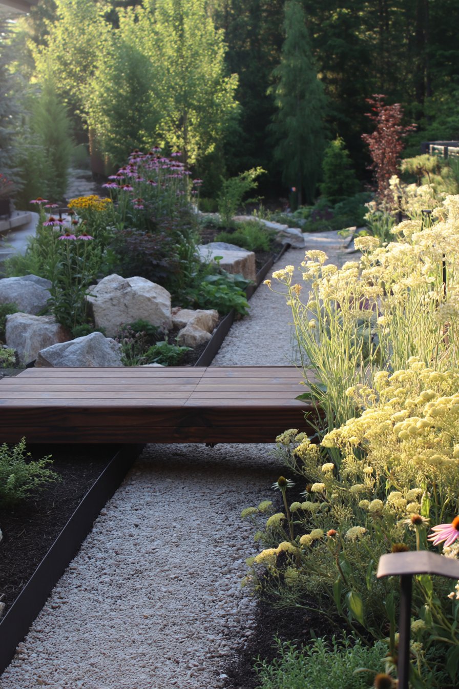 In this design, the harmonious blend of vibrant coneflowers and delicate yellow yarrow creates a lively yet tranquil atmosphere, perfect for relaxation. To replicate this look, consider using natural stone elements and a wooden bridge to enhance the garden’s organic feel while ensuring easy access through winding pathways.