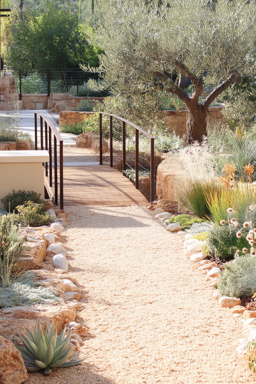This contemporary garden features striking agaves and ornamental grasses, harmonizing earthy tones with sleek, modern lines. To replicate this look, integrate gravel pathways and a simple bridge to create visual interest and accessibility.