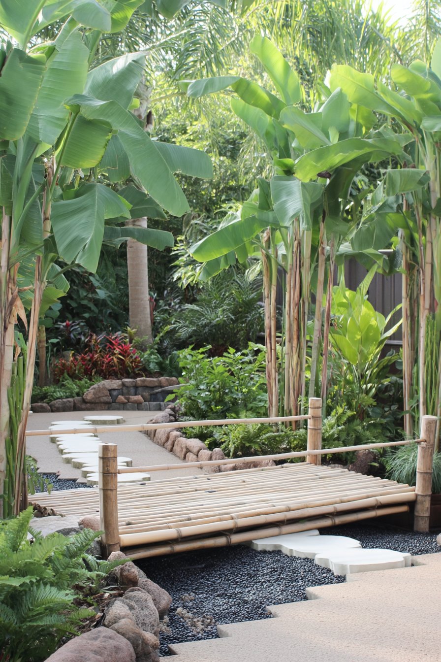 Lush, towering banana plants and vibrant tropical foliage create a serene, immersive pathway that invites exploration. To replicate this look, incorporate bamboo accents and mix colorful plants like bromeliads for added texture and interest.