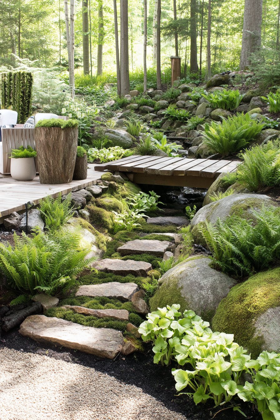 A serene woodland setting is achieved with lush ferns, vibrant moss, and a charming wooden bridge, inviting tranquility and exploration. To replicate this look, incorporate and natural stone pathways for a cohesive, calming atmosphere.