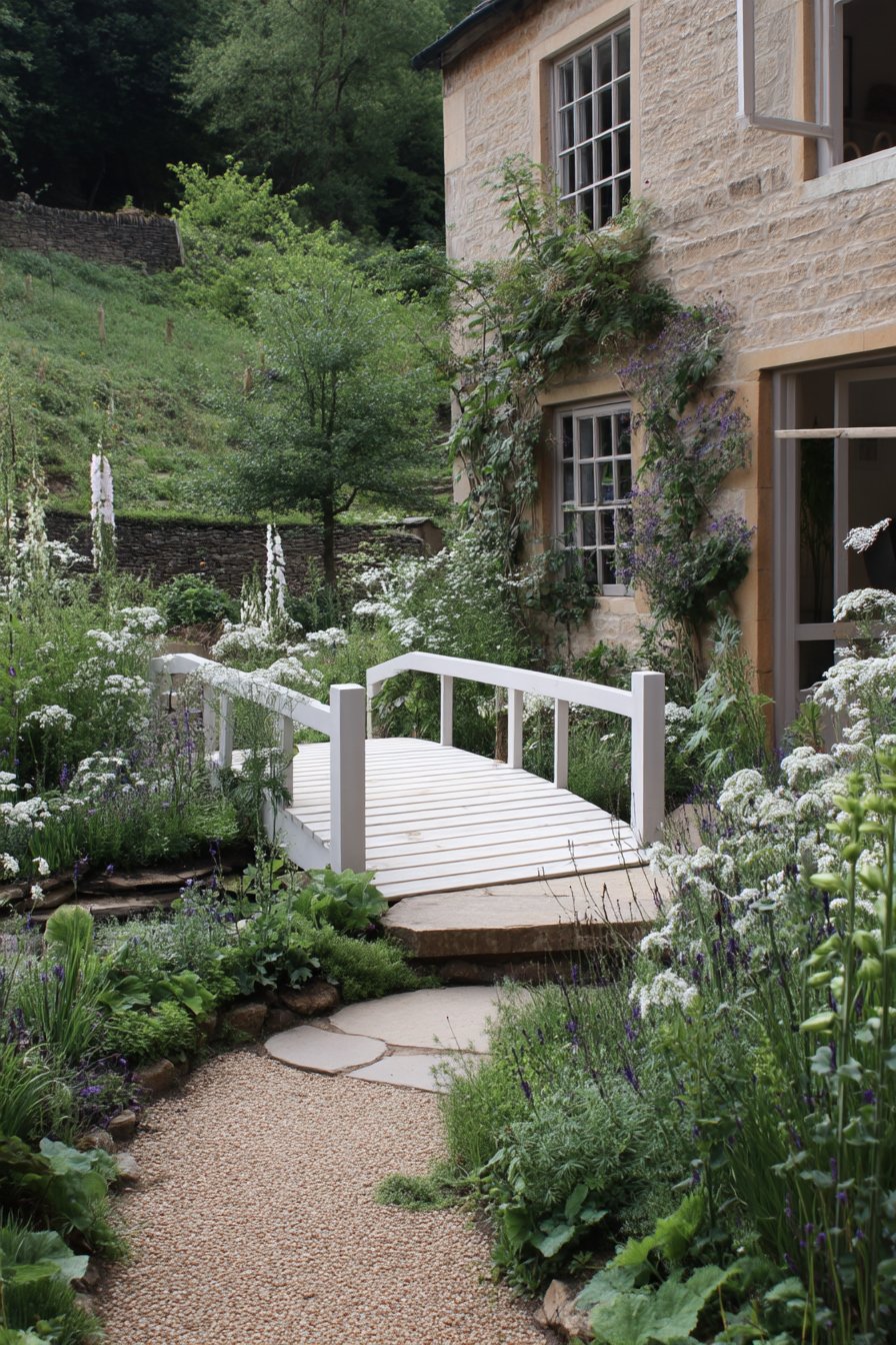 A charming wooden bridge gracefully arches over a pathway adorned with lush white and purple blooms, creating a serene, inviting atmosphere. To replicate this look, incorporate perennials like foxgloves and lavender, and use natural stone for pathways to enhance rustic appeal.
