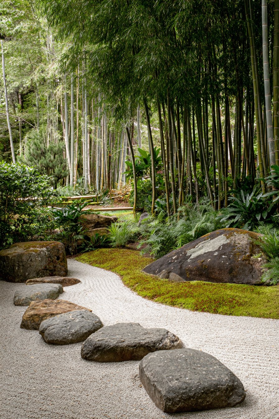 This garden beautifully blends smooth gravel paths with natural stones, creating a calm and inviting space. Incorporate bamboo and low-maintenance ferns for lush greenery, while adding rocks to define pathways and enhance texture.