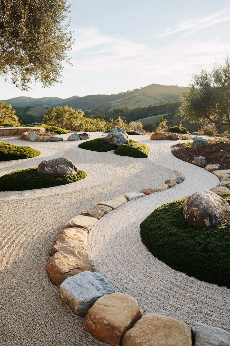 This garden blends smooth gravel with lush green mounds and large stones, creating a calming, balanced feel. For a similar look, use raked gravel, moss, and strategically placed rocks to enhance tranquility.