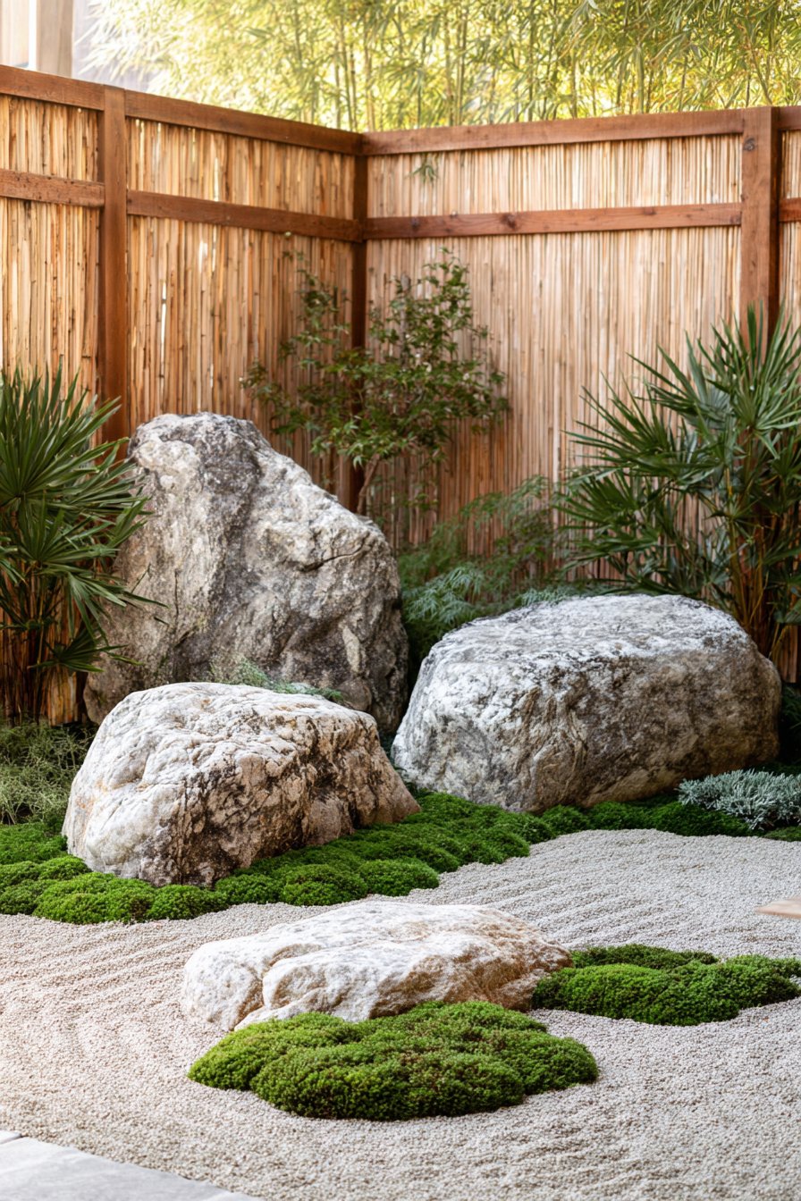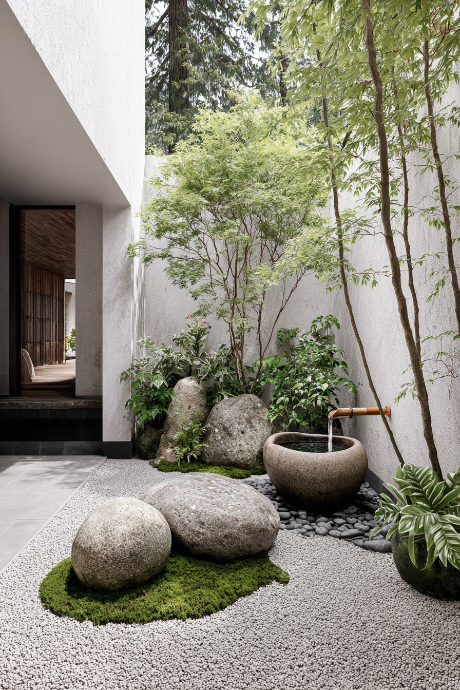 This rock garden showcases soothing textures with carefully placed stones and soft moss, creating a peaceful vibe. To achieve a similar look, use gravel for pathways and select low-maintenance plants like moss and bamboo for greenery.