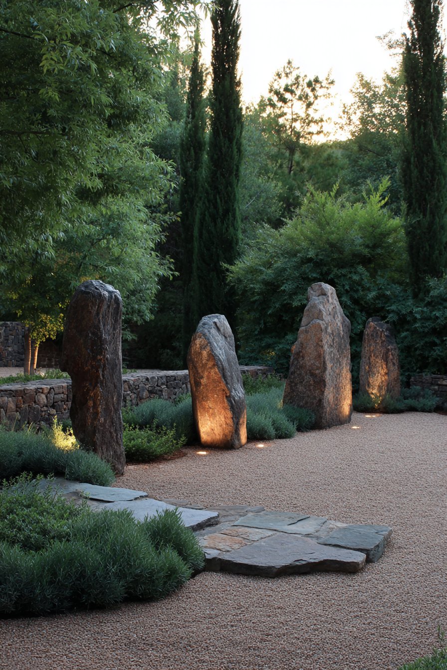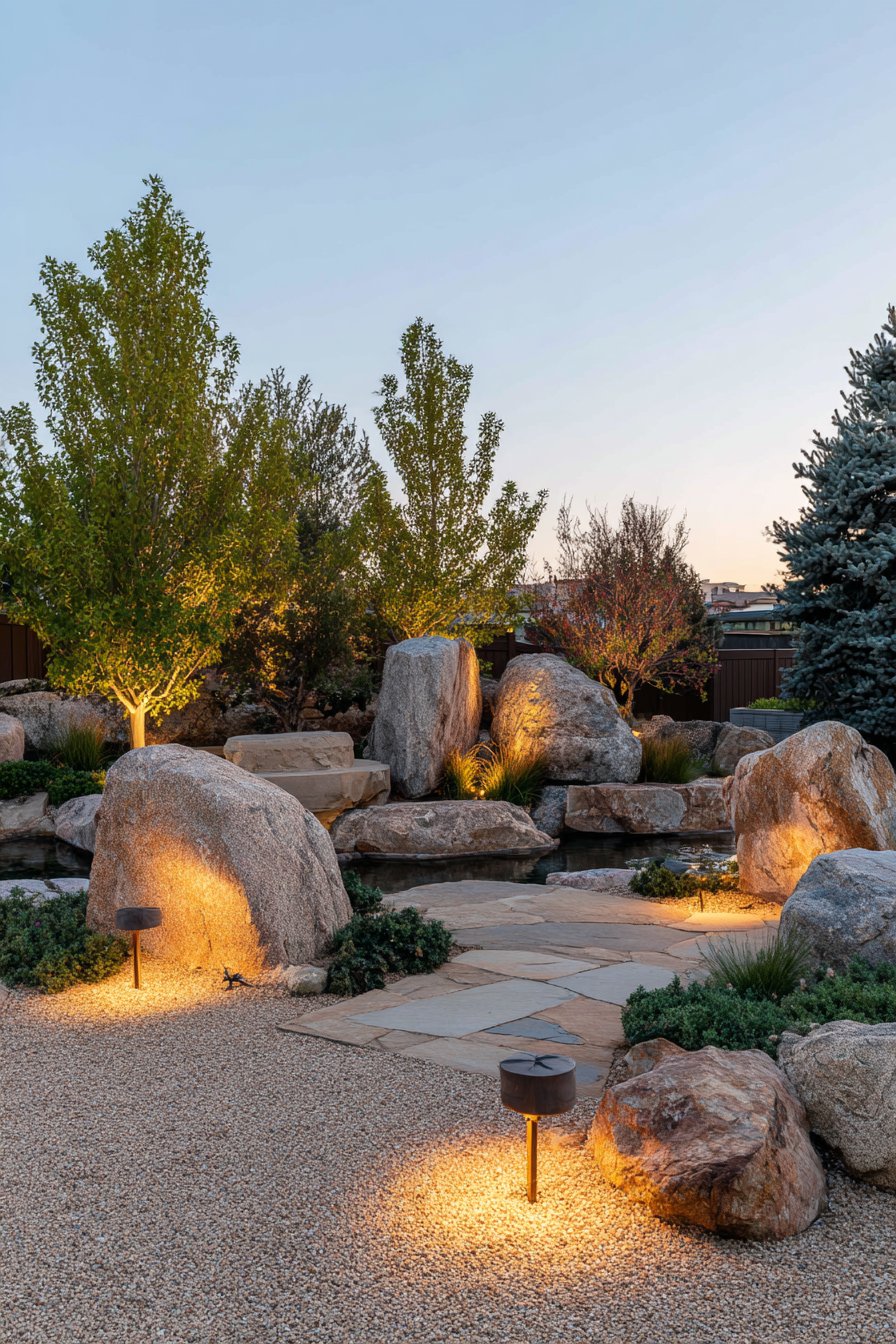 The blend of smooth stones, soft grasses, and warm lighting creates a serene atmosphere perfect for relaxation. To achieve this look, use natural stones, low-maintenance plants, and subtle lighting to enhance the tranquility.