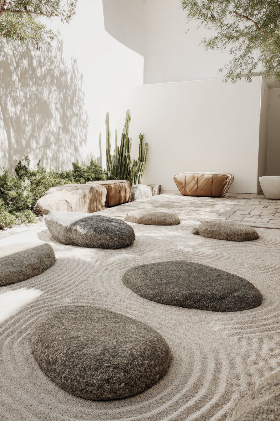A minimalist rock garden features smooth stones set in raked sand, creating a calming and serene atmosphere. To achieve this look, use natural stones, fine gravel, and low-maintenance plants like succulents or ornamental grasses for texture.