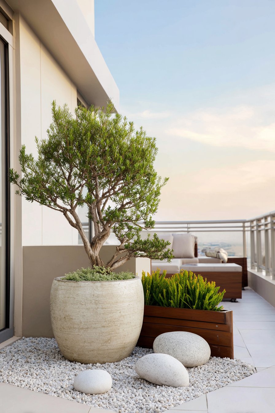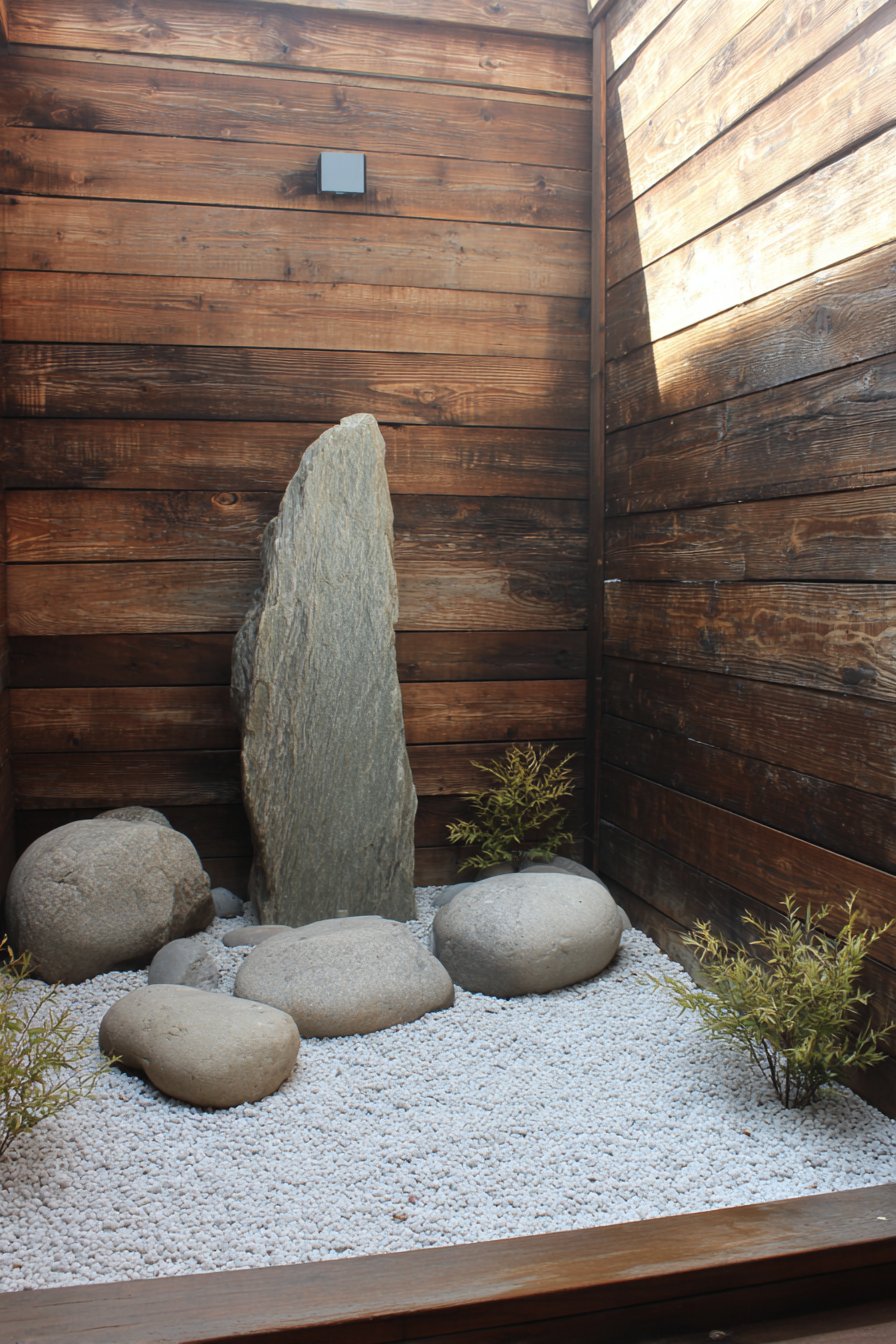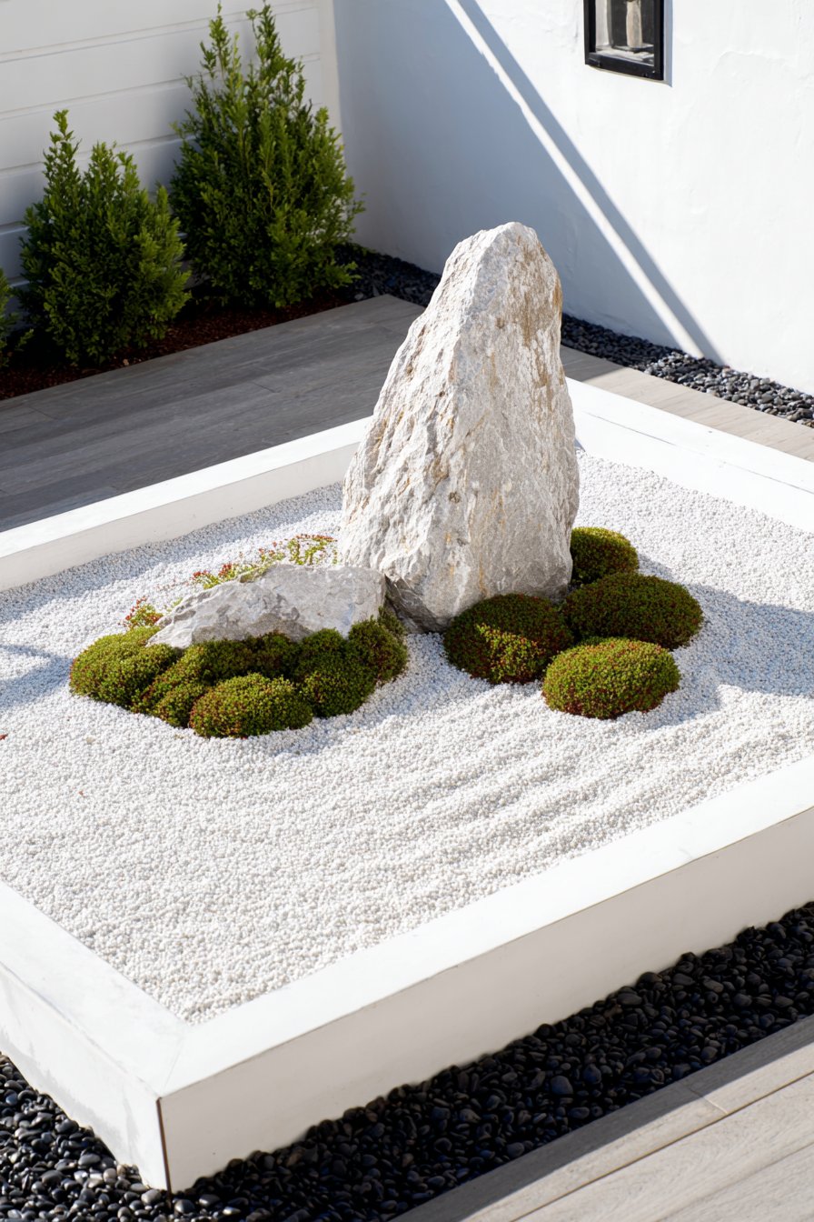 A minimalist rock garden creates a calm space with smooth stones, white gravel, and subtle greenery. To replicate this look, choose a few larger rocks, add fine gravel, and plant low-maintenance shrubs like dwarf bamboo.