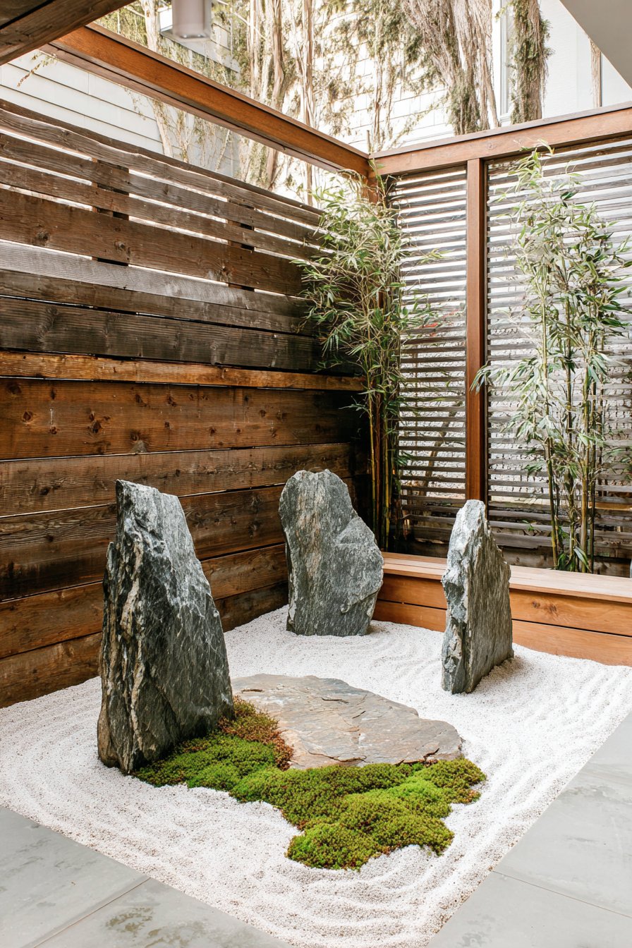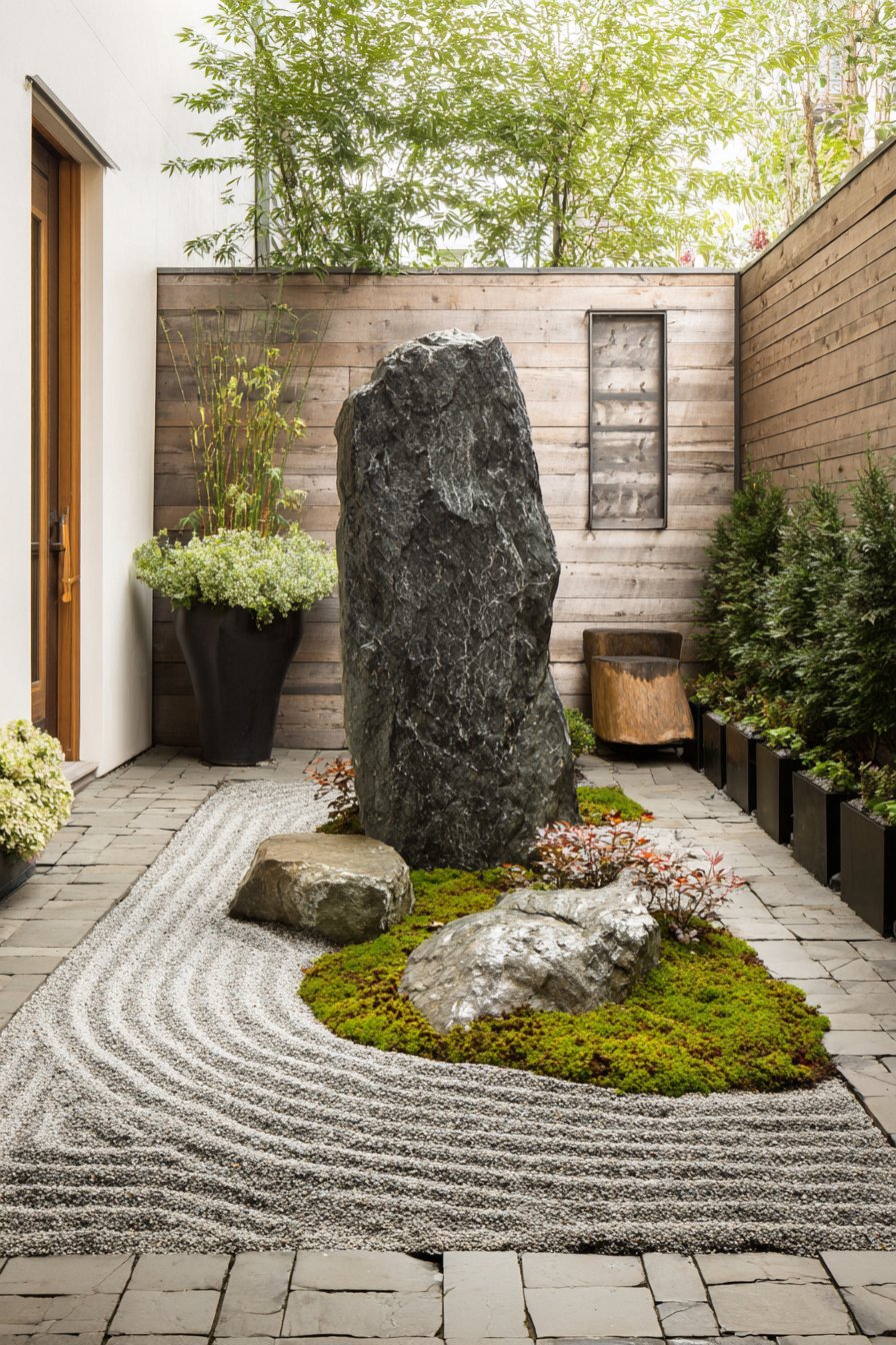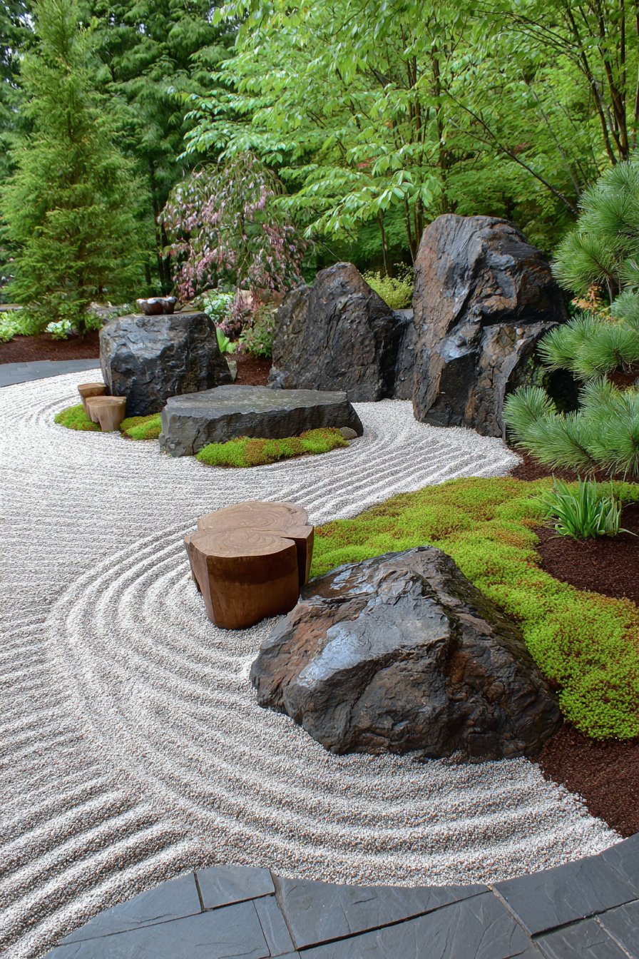 This serene rock garden combines smooth stones, soft moss, and raked gravel to create a peaceful retreat. To achieve this look, use natural materials and consider adding bamboo for a touch of greenery.