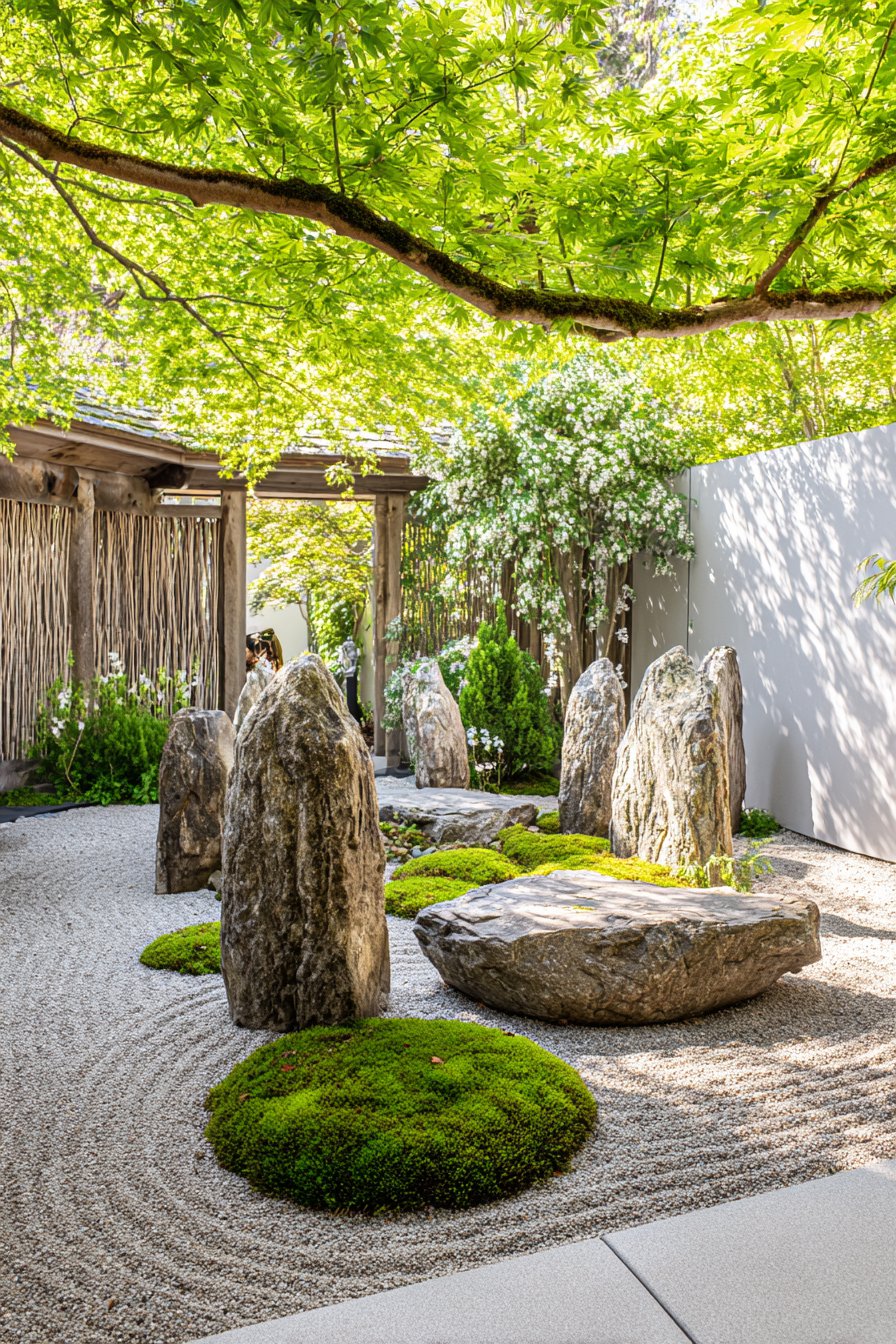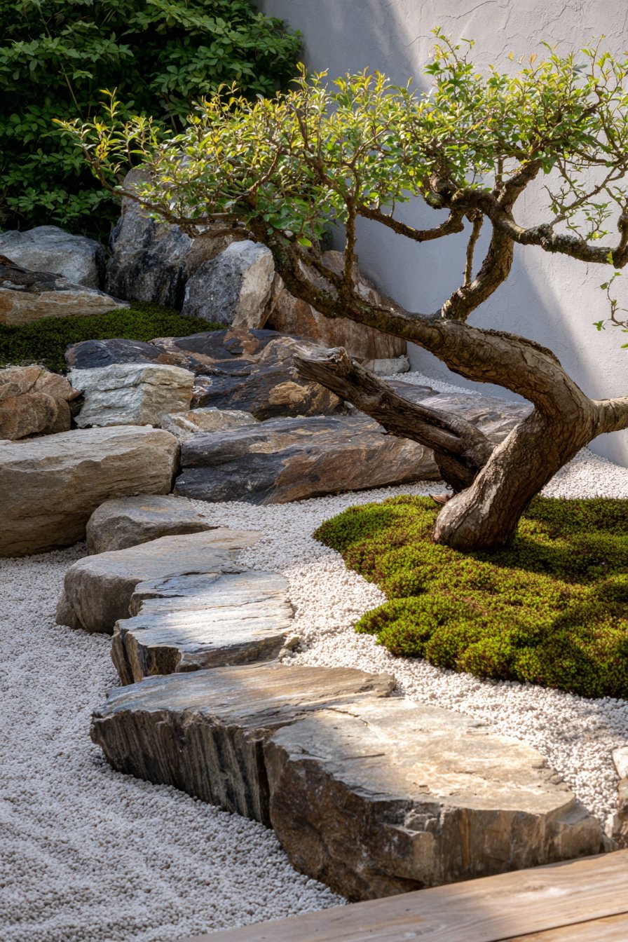 This garden features smooth stones, soft moss, and a gnarled tree, creating a peaceful vibe. To replicate this look, use gravel for paths and choose low-maintenance plants like moss and small shrubs.