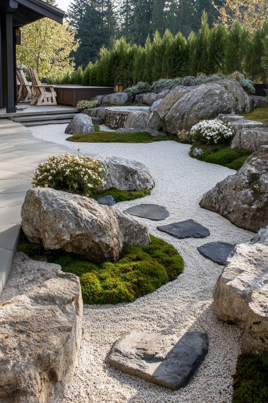 The calm white gravel contrasts beautifully with lush green moss and the striking rock formations, creating a peaceful retreat. For a similar look, use smooth stones, low-maintenance plants like moss or sedum, and keep the layout simple.