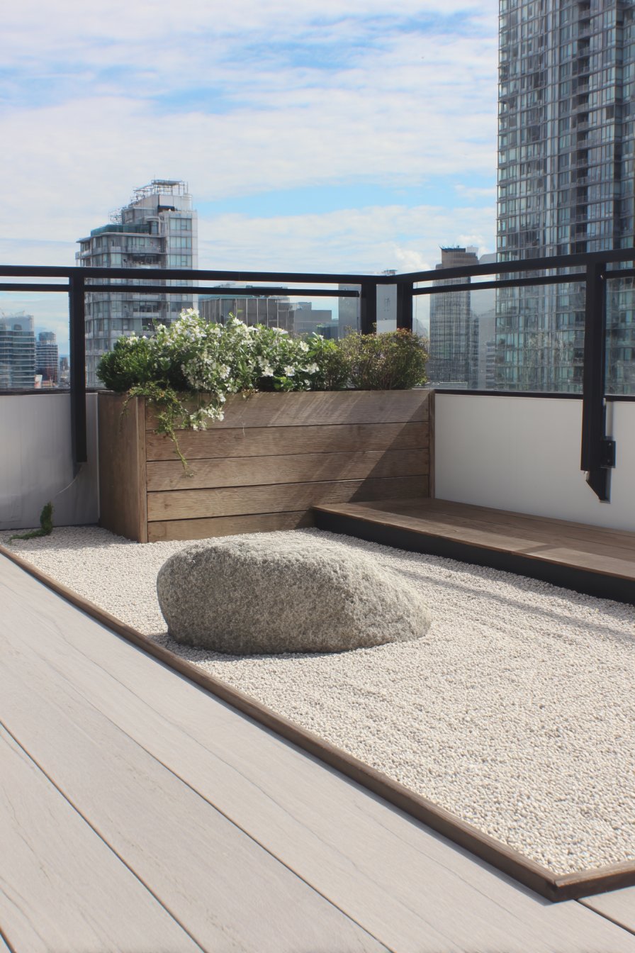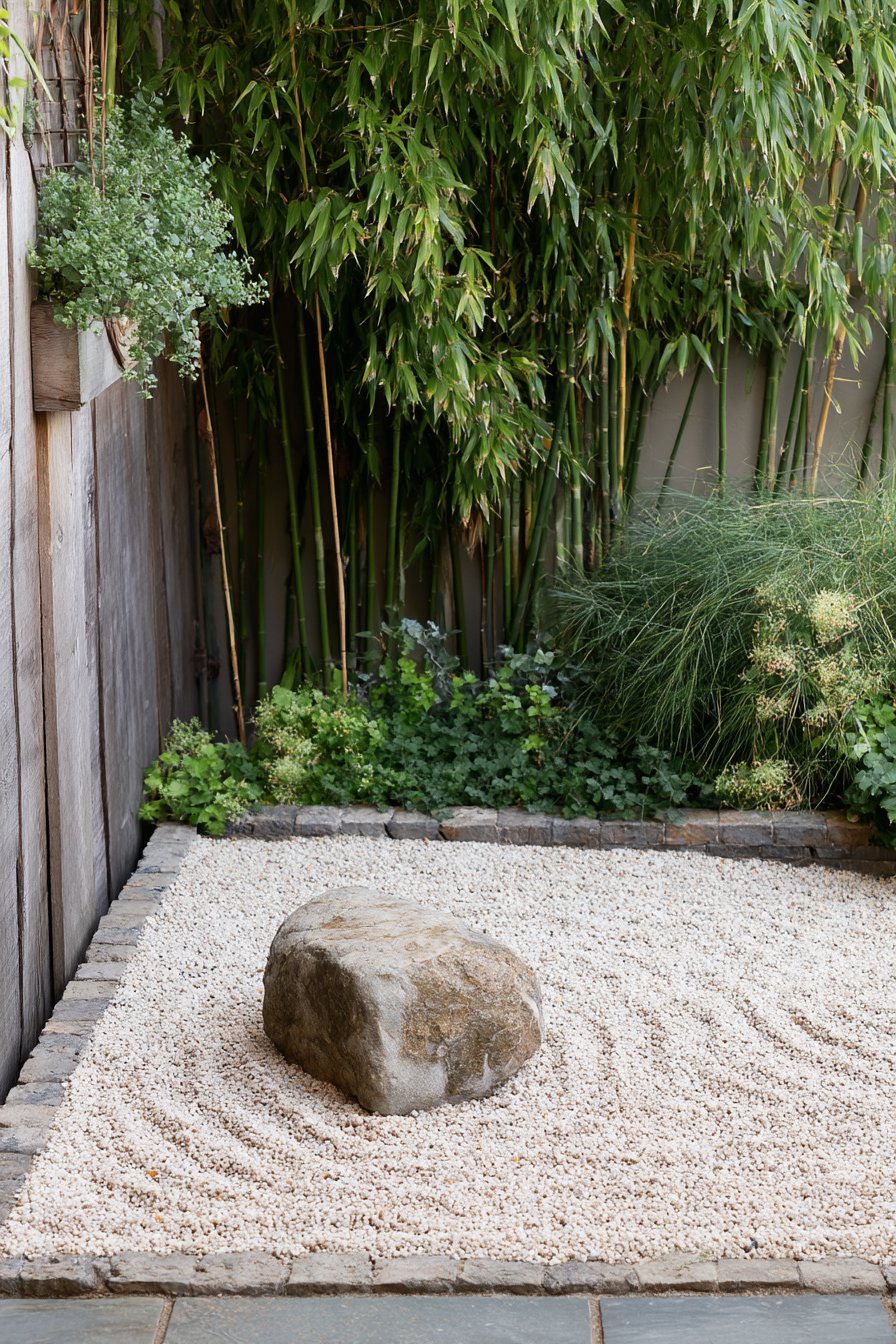 To recreate this look, include a large, natural stone as a focal point and surround it with finely raked gravel. Add bamboo or similar tall plants to create privacy and enhance the calming atmosphere.