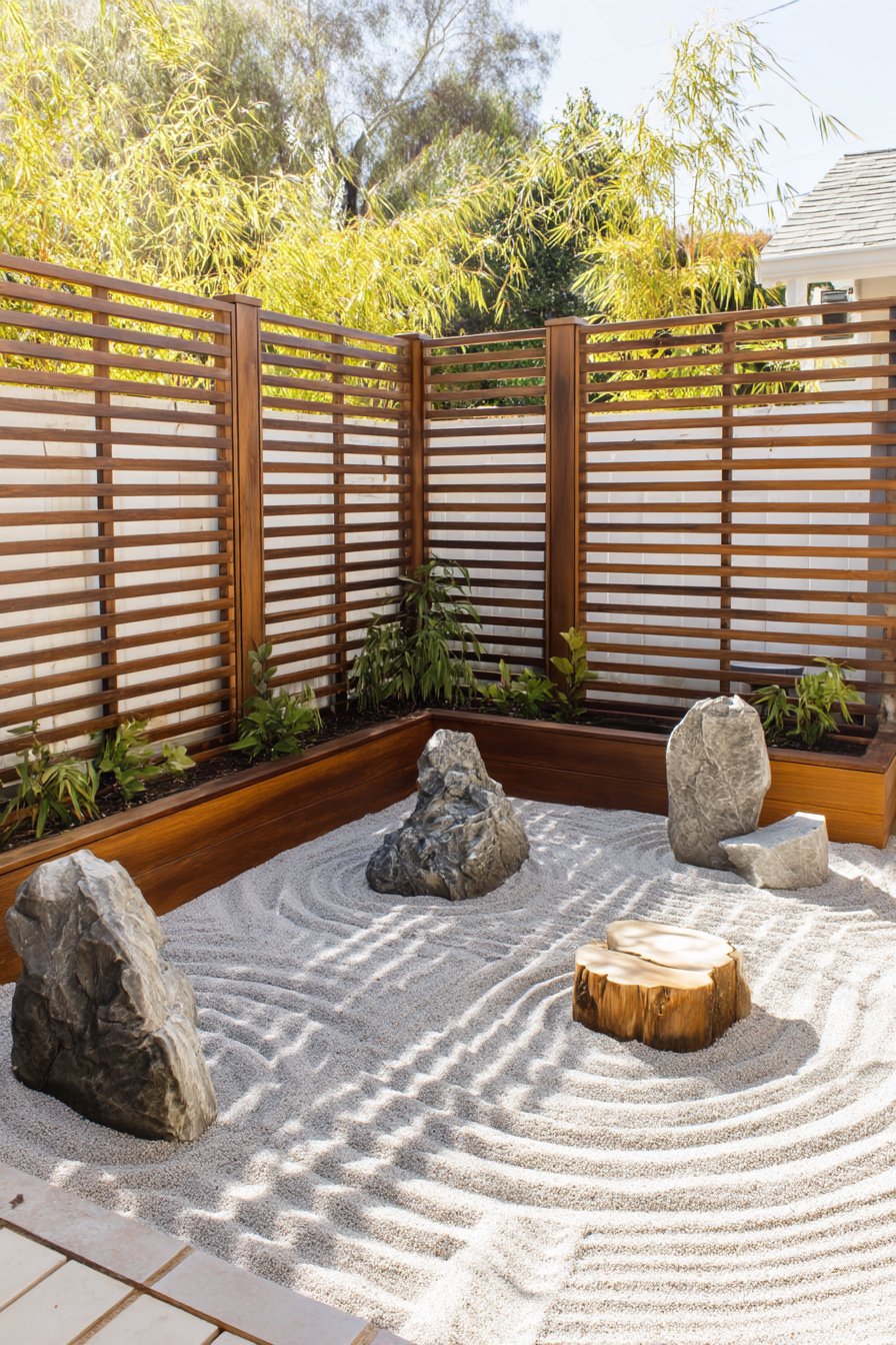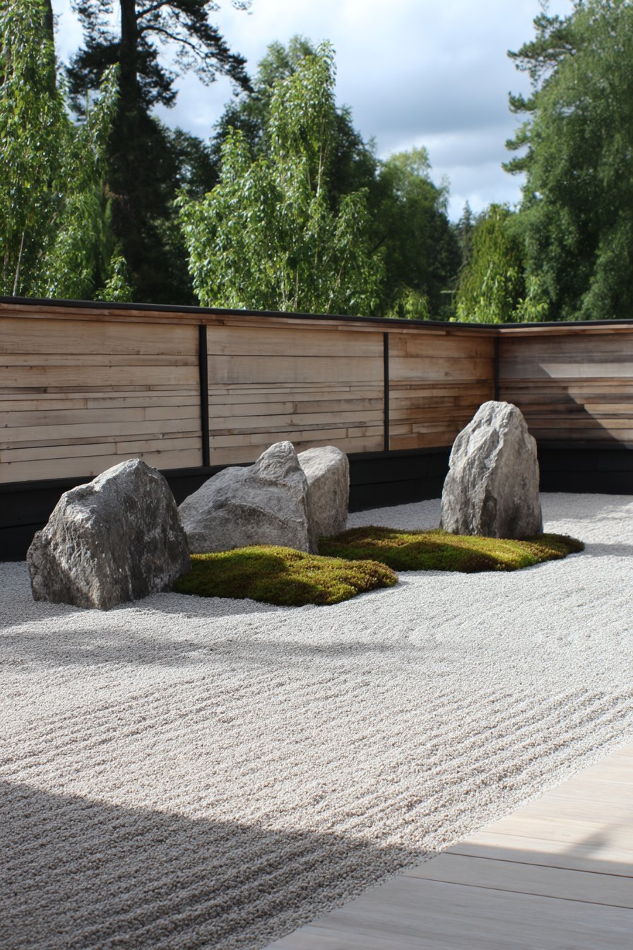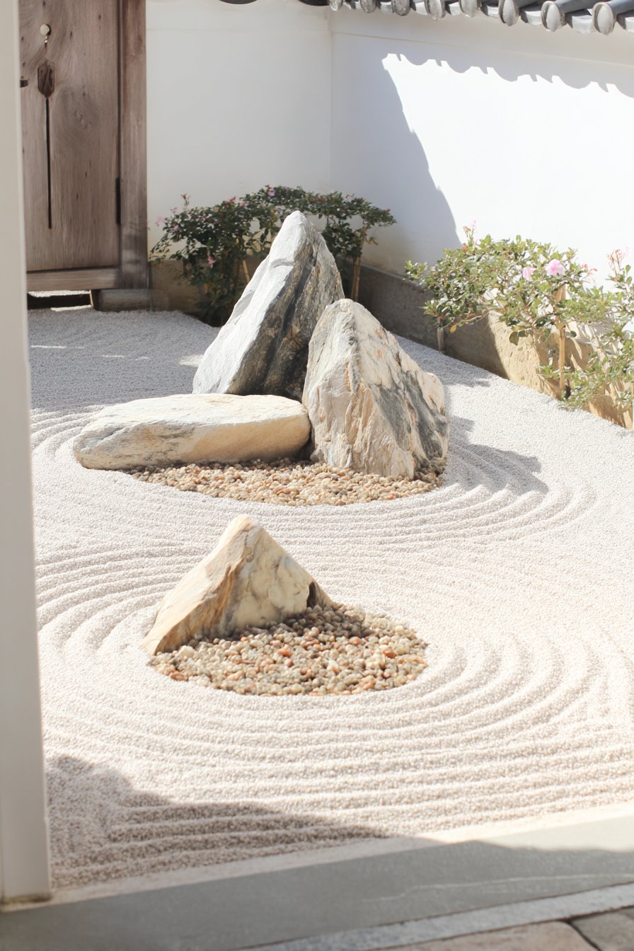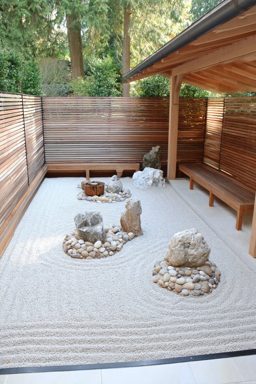 To recreate this look, include large, varied stones, fine white sand, and low-maintenance plants like moss or small shrubs. Consider bamboo accents or a simple wooden structure to complete the Zen aesthetic.