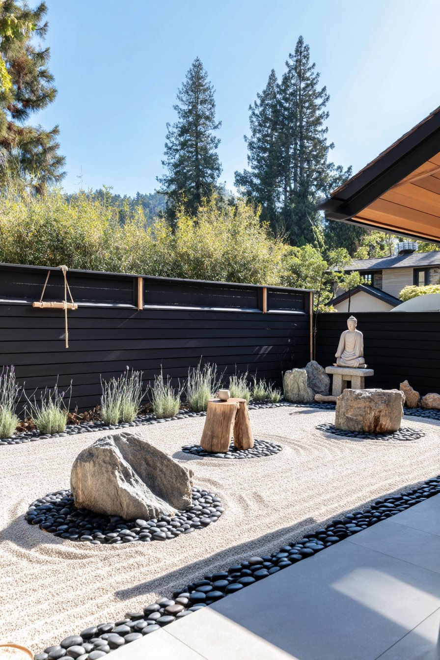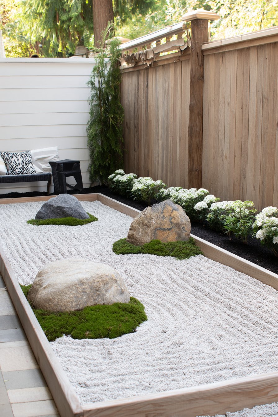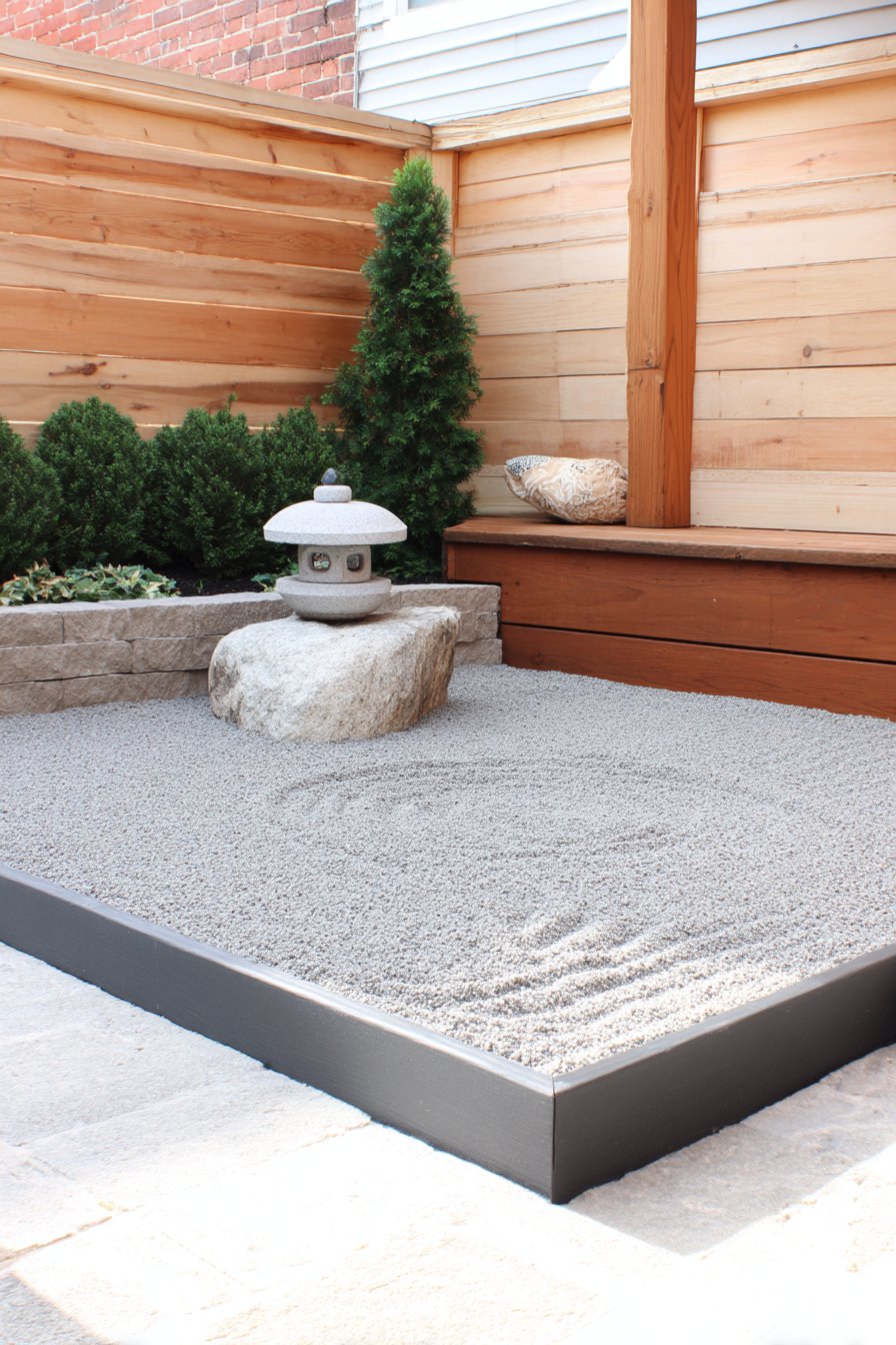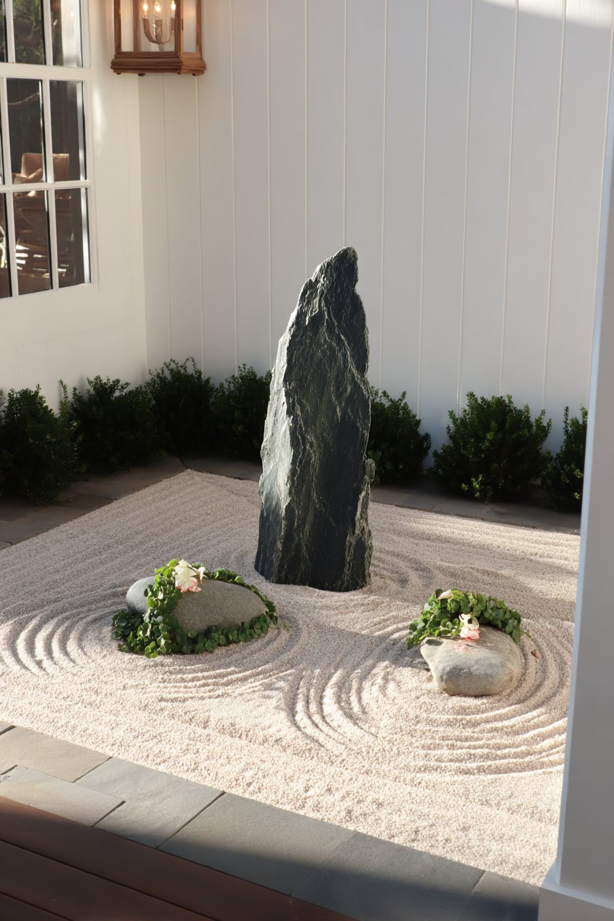 To recreate this look, include large, varied stones, fine white sand, and low-maintenance plants like moss or small shrubs. Consider bamboo accents or a simple wooden structure to complete the Zen aesthetic.
