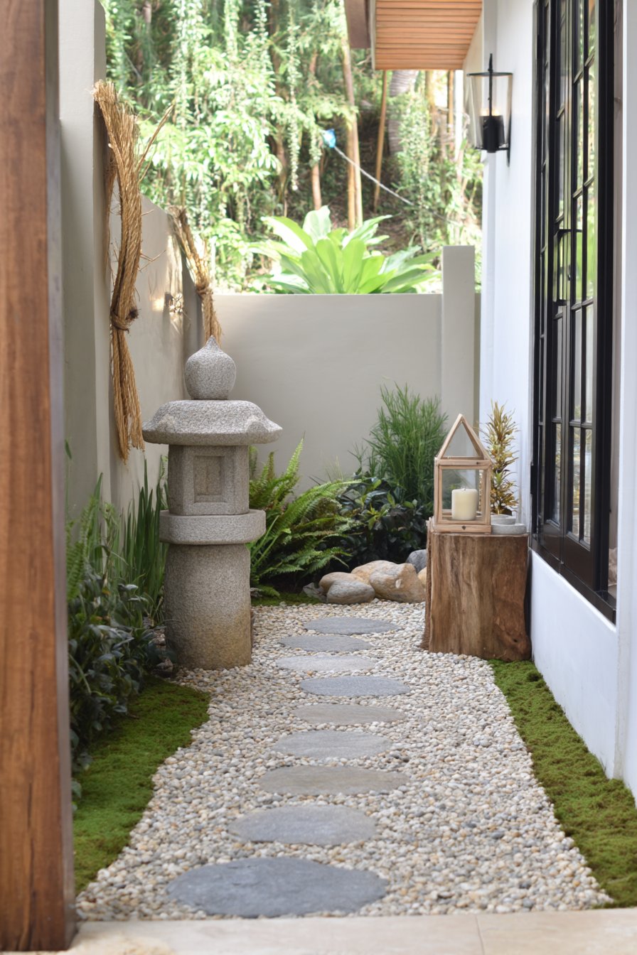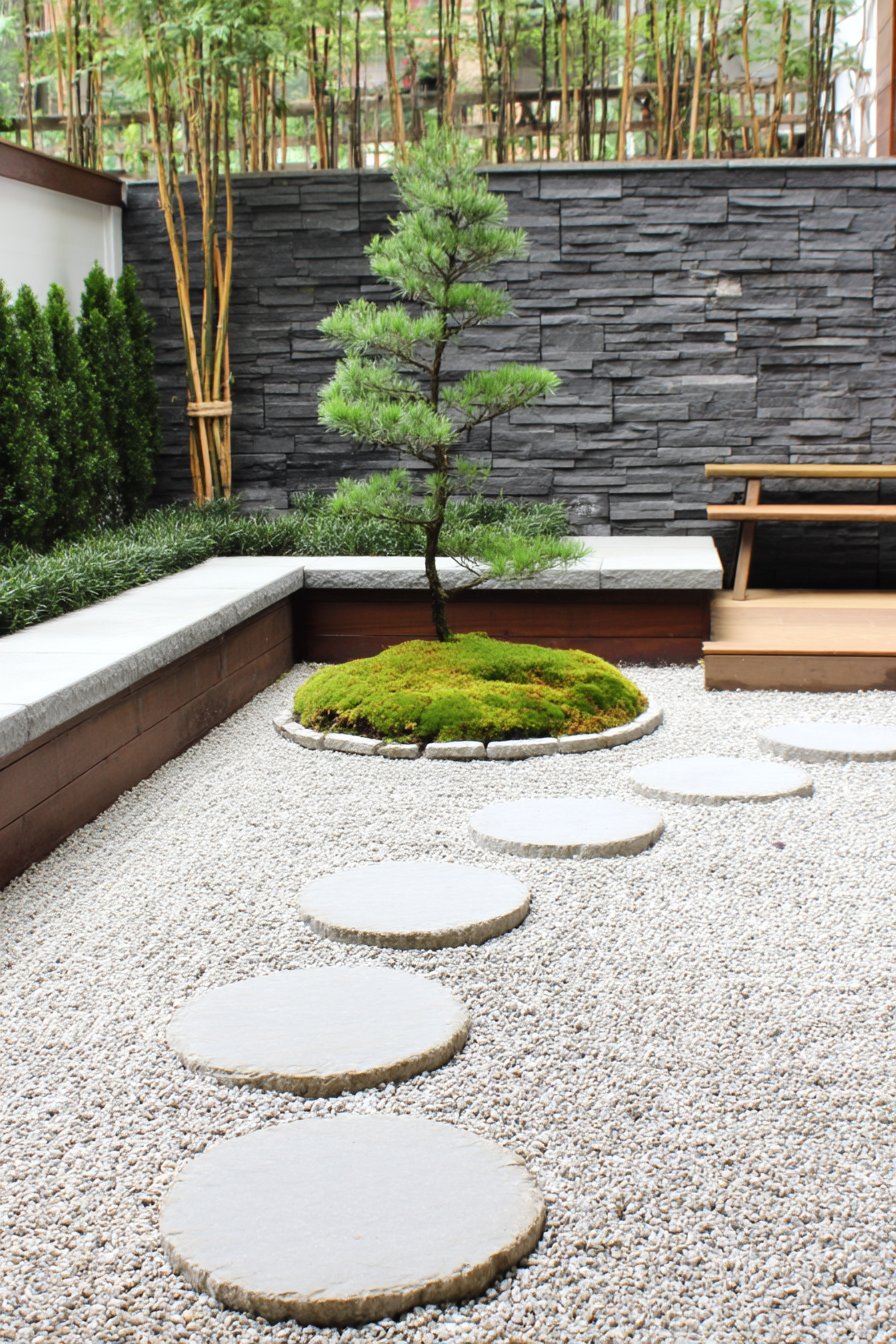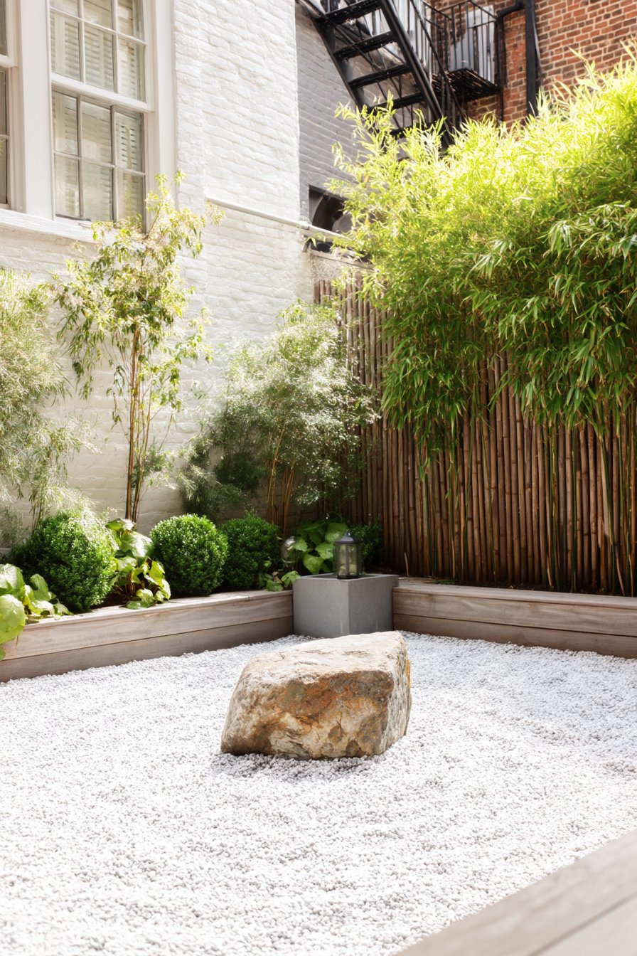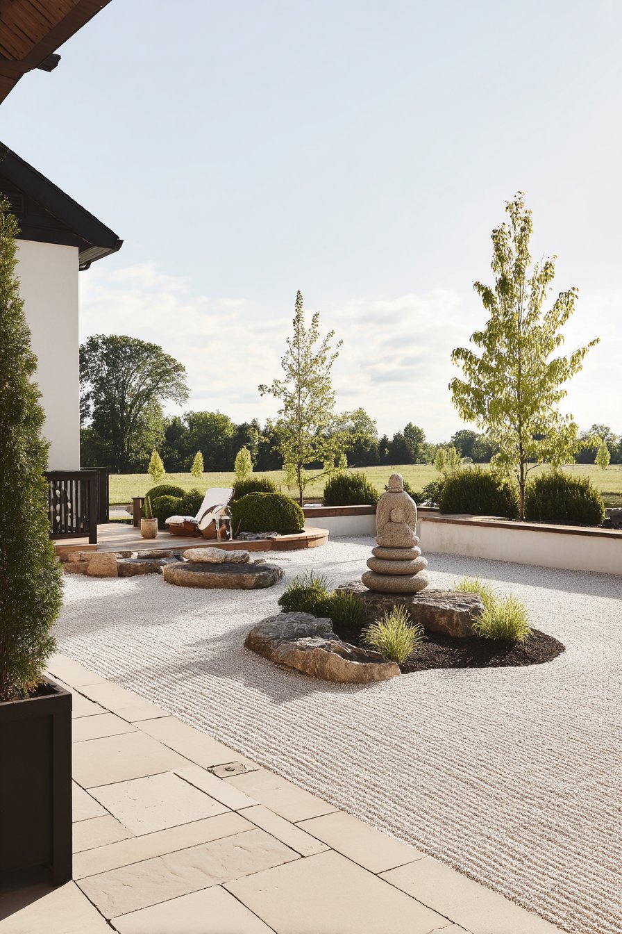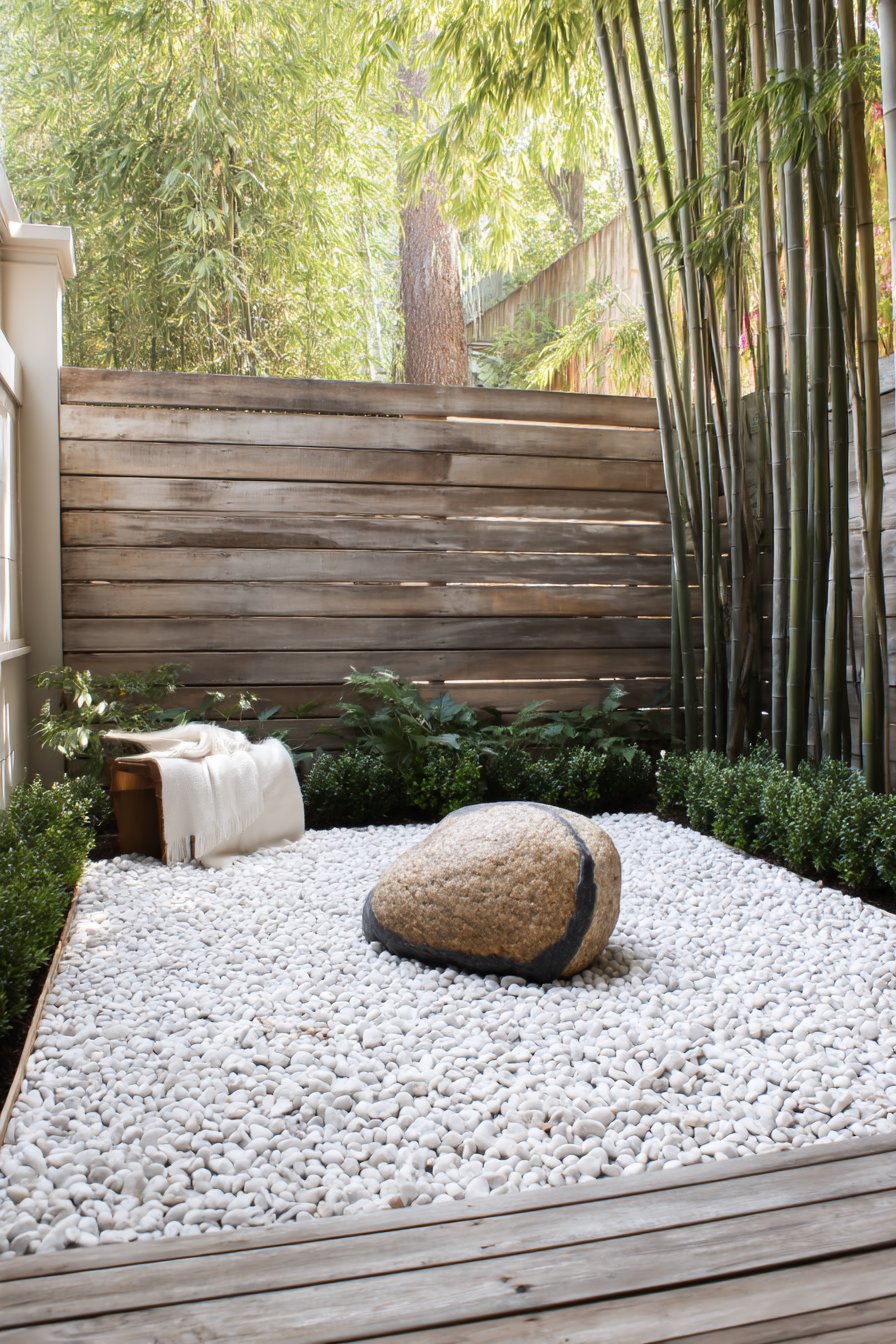 To recreate this look, include , smooth stones, and a comfortable seating area for relaxation. A layer of white gravel will complete the serene aesthetic beautifully.