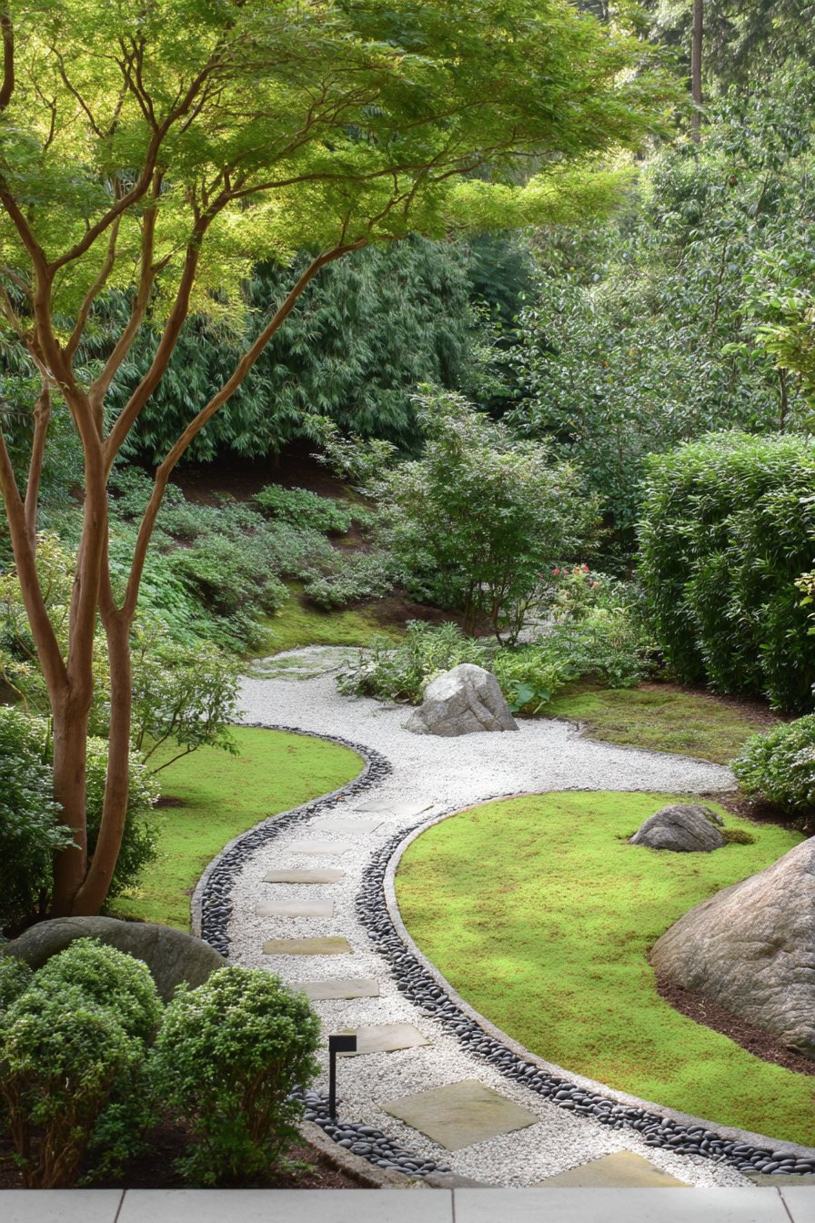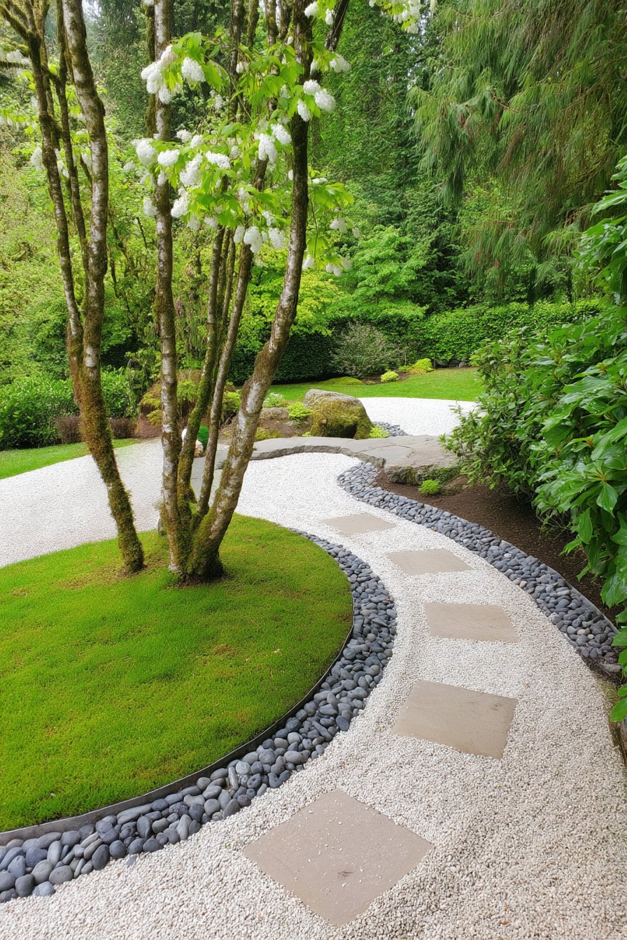A harmonious blend of gravel and stone creates a tranquil space, while gentle curves invite contemplation and relaxation. Incorporate natural textures and minimalist plantings to evoke a serene atmosphere reminiscent of traditional Japanese Zen gardens.