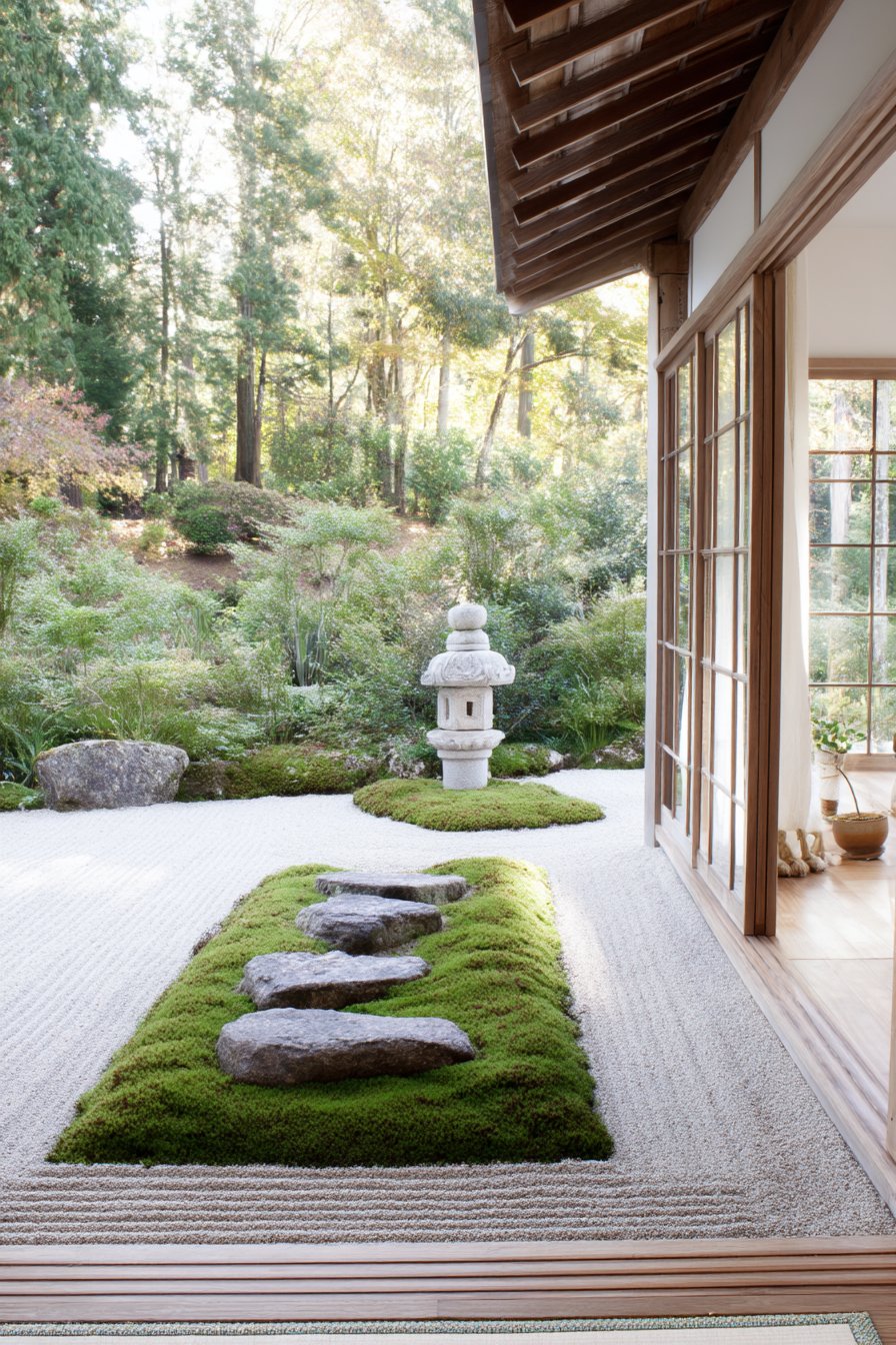 This serene garden design elegantly combines soft moss, smooth stones, and raked gravel, creating a peaceful retreat that invites mindfulness and tranquility. Incorporate natural elements like a lantern and carefully placed stones to achieve a balanced, harmonious aesthetic that reflects nature’s simplicity.