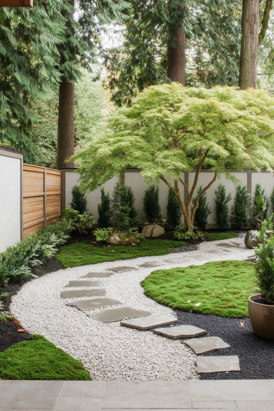 Must-have elements include Japanese maples for vibrant foliage, stepping stones for defined paths, and carefully placed rocks to enhance the natural feel. Add fine gravel and lush ground cover to complete the soothing atmosphere.
