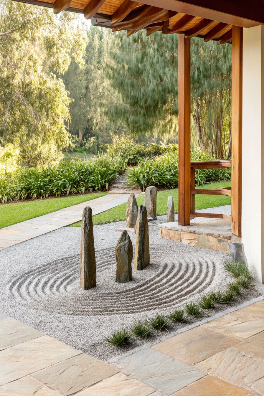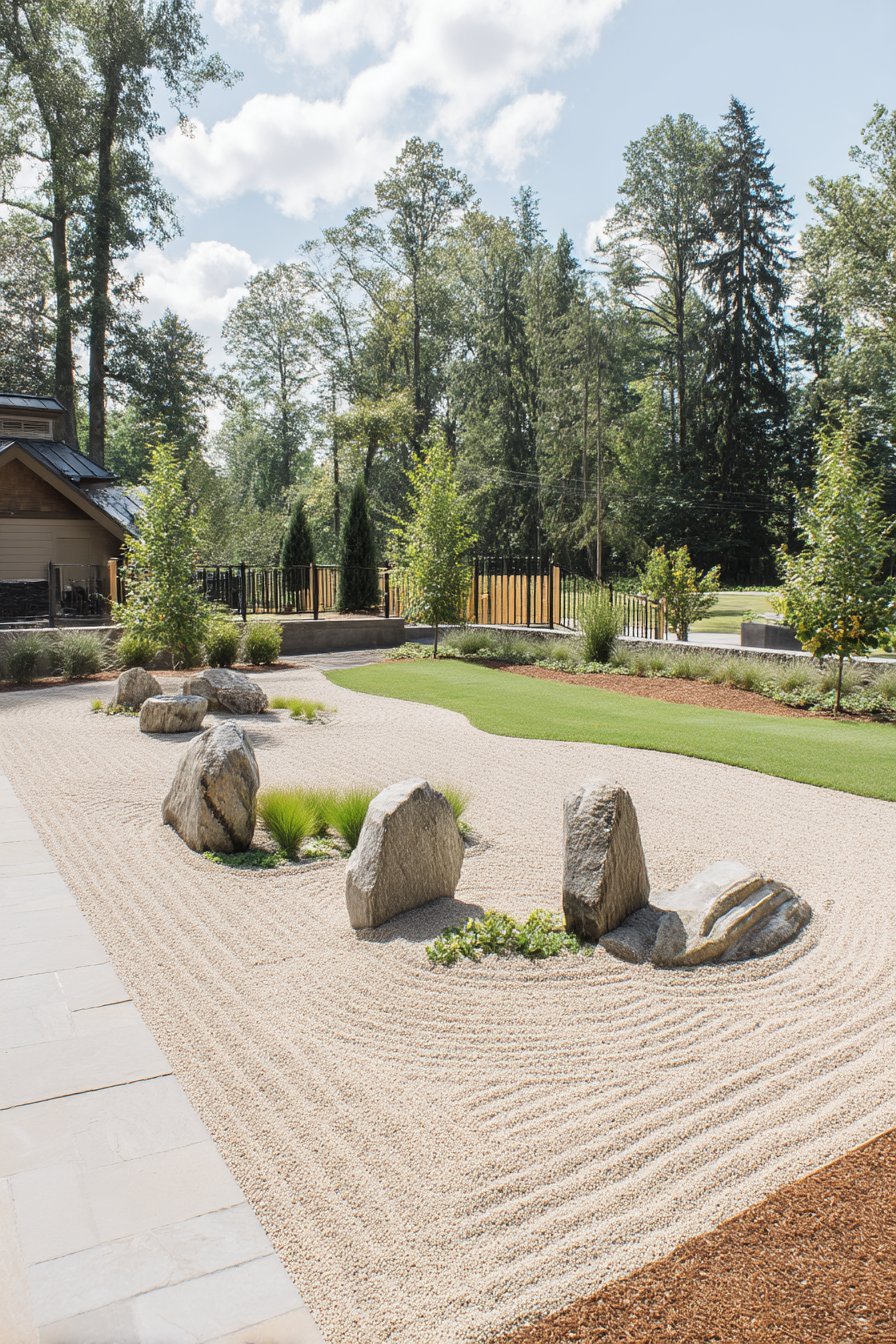 To recreate this look, include strategically placed boulders, low-maintenance grasses, and a focal point like a stone sculpture or water feature. Consider using gravel or sand to define spaces and enhance the Zen aesthetic.