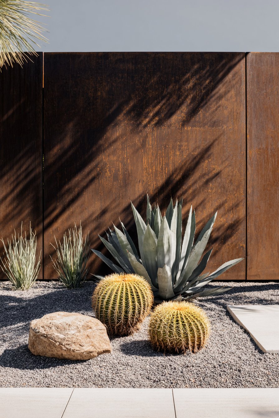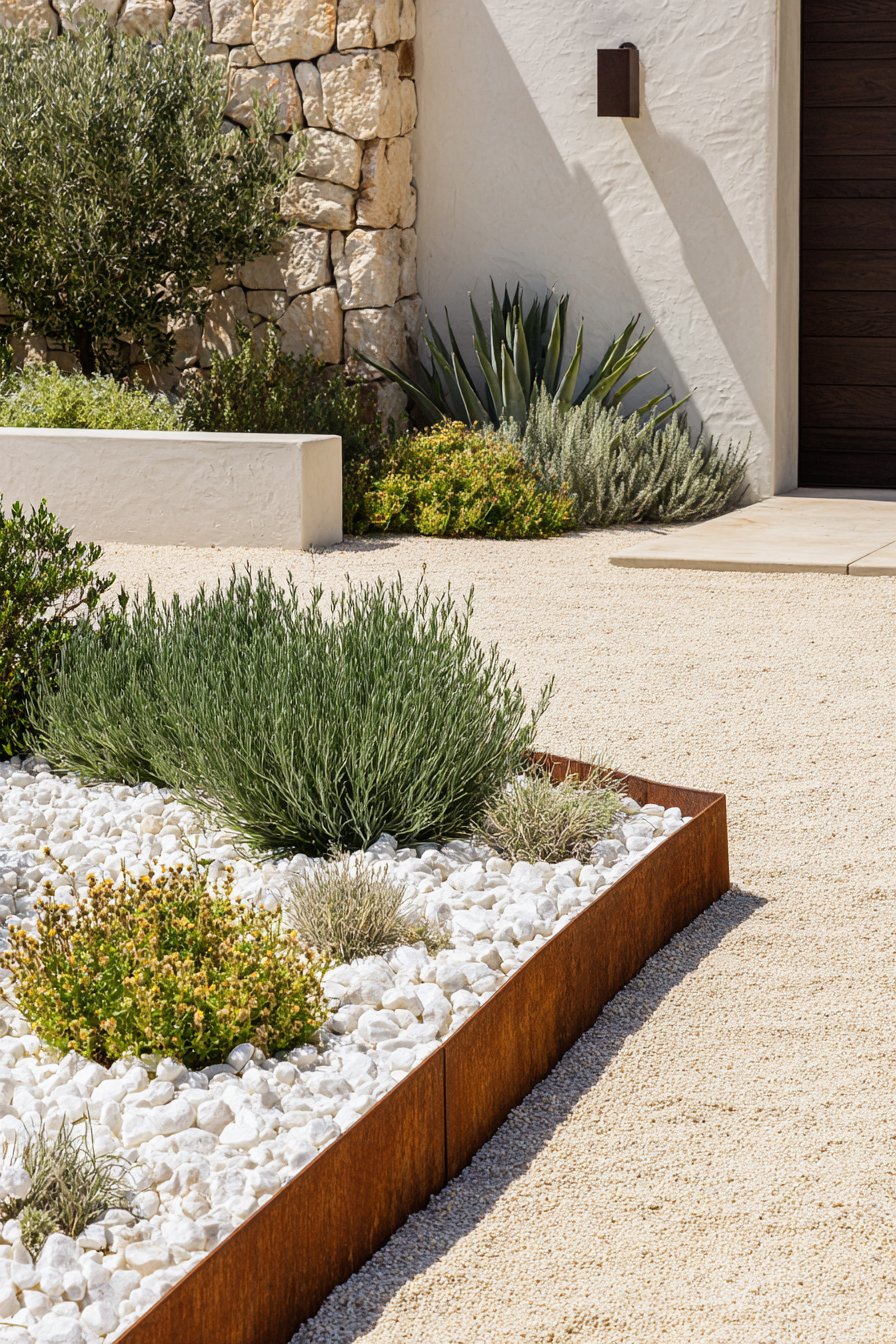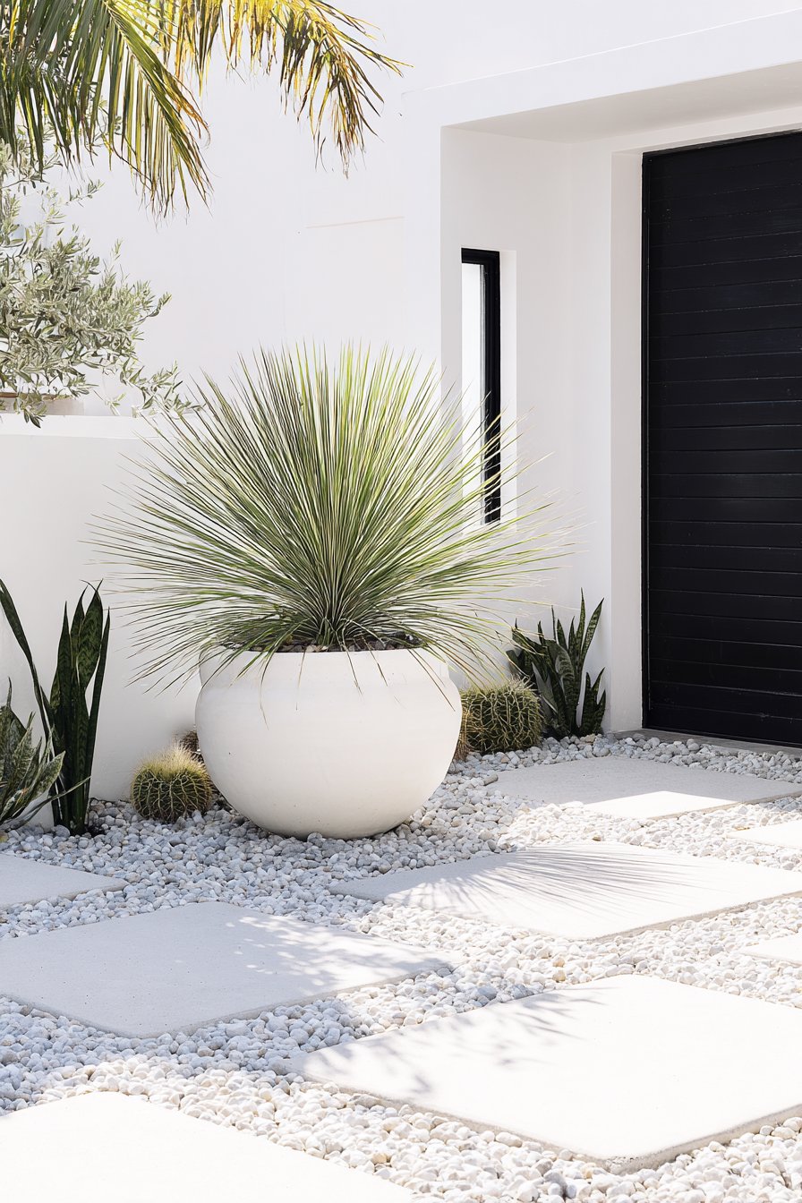 To recreate this look, consider planting Yucca, Sansevieria, and various Cacti, complemented by gravel pathways and large, simple pots.