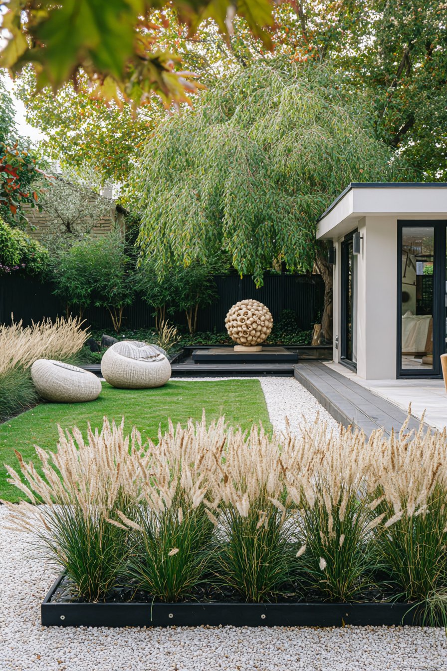 The design’s clean lines and soft textures create a serene atmosphere, enhanced by ornamental grasses that sway gently in the breeze. To achieve a similar look, incorporate minimal hardscaping with natural materials and layered plantings for depth and interest.