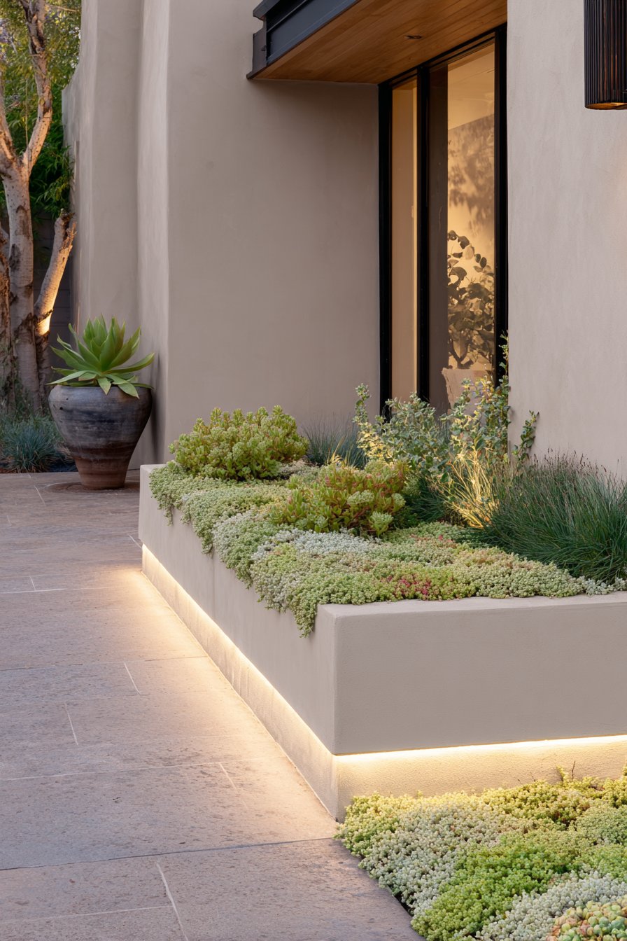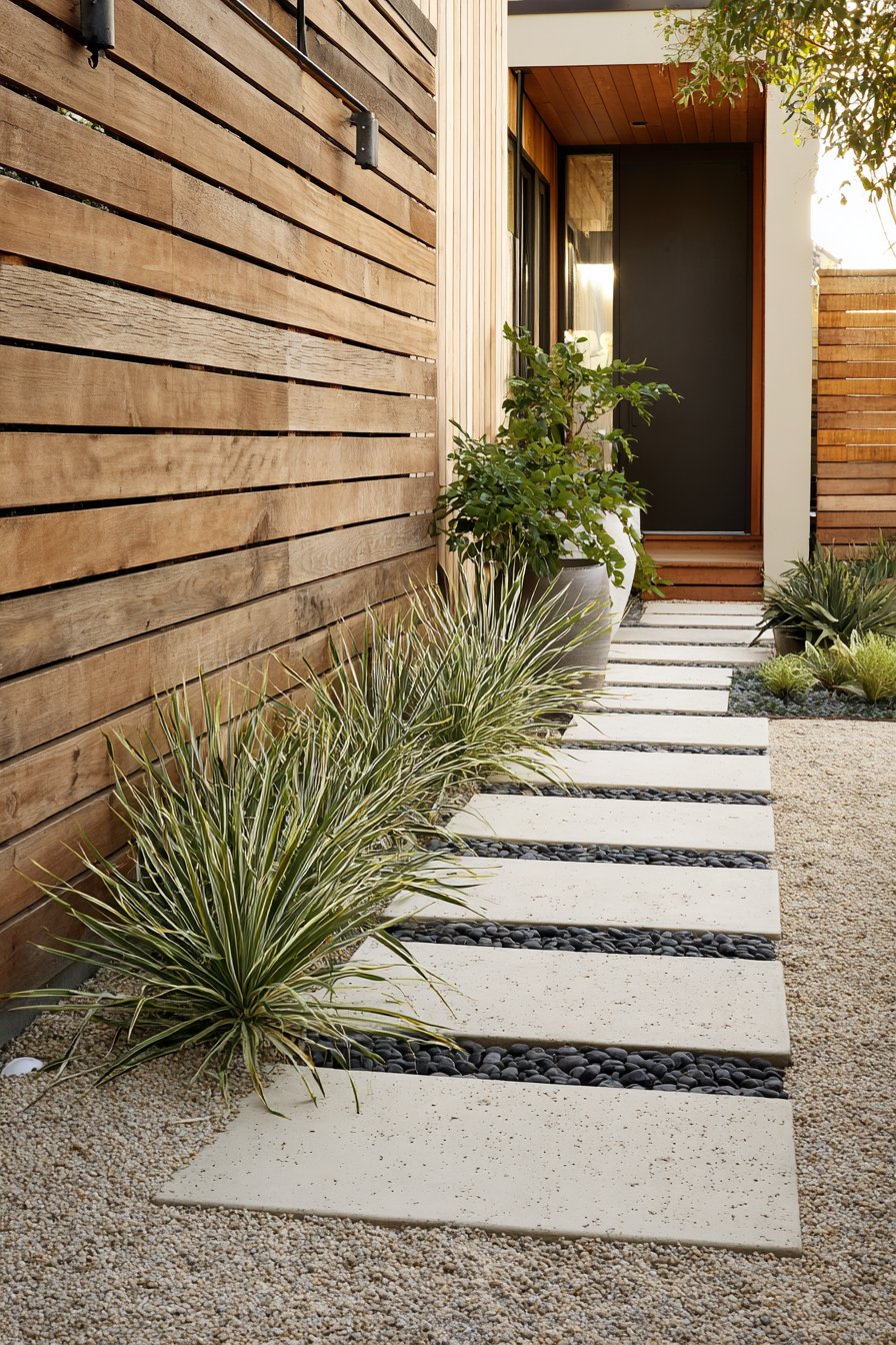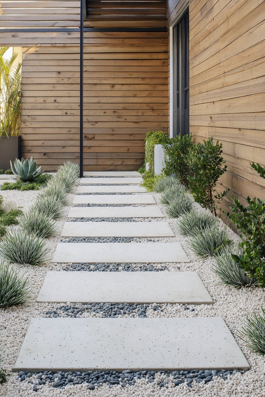 The clean lines of the concrete pathway beautifully contrast with the soft textures of succulents and ornamental grasses, creating a serene and modern aesthetic. To achieve this look, consider using a mix of gravel and pebbles for drainage, paired with strategically placed plants for visual interest.