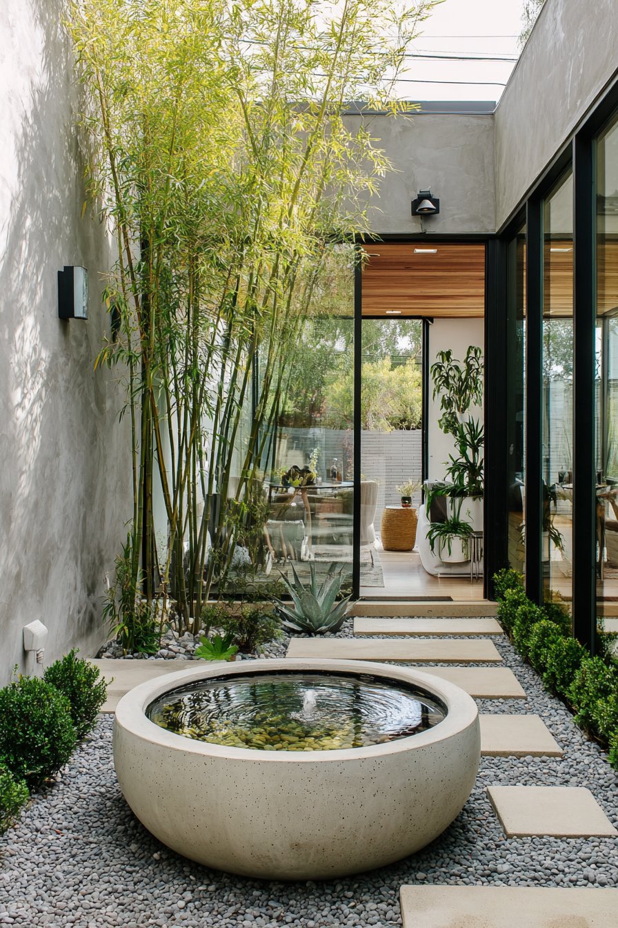 The serene minimalist design features lush bamboo and smooth stone pathways, creating a tranquil oasis that invites relaxation and contemplation. To replicate this look, incorporate natural materials and a water feature to enhance the calming atmosphere.